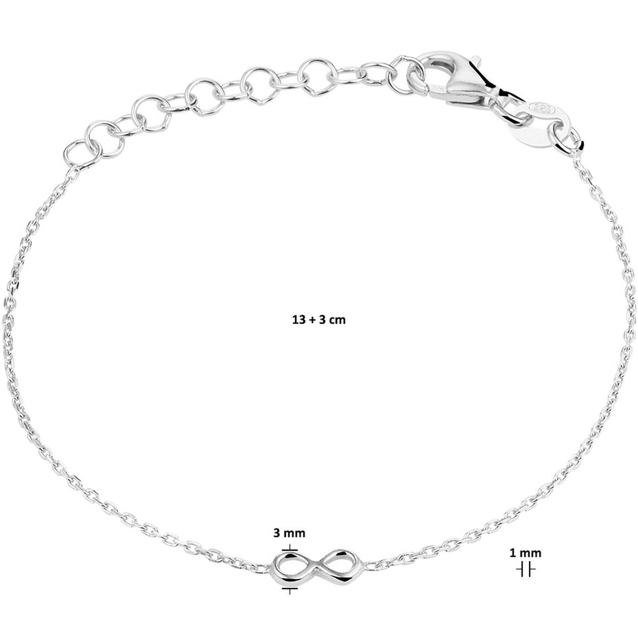 Gerhodineerd 925 zilveren anker armband uitgevoerd met een infinity hanger en een karabijn sluiting. De armband heeft een draaglengte van 13cm en een extensie van 3cm.