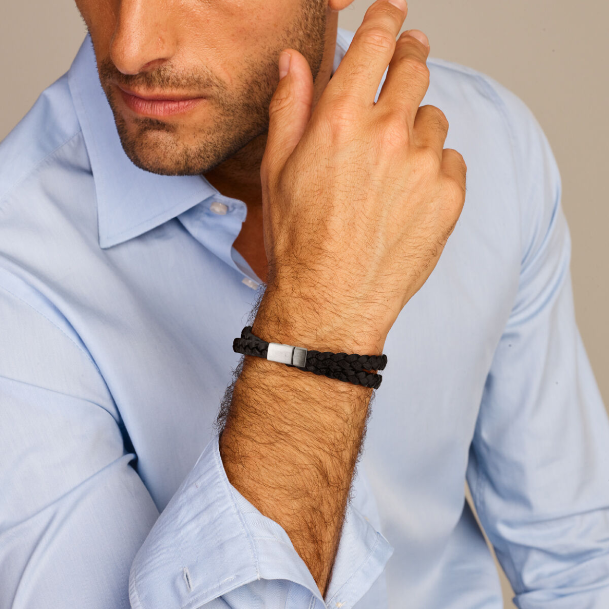 Gerhodineerd 925 zilveren armband uitgevoerd met zwart leer en een magneetsluiting.