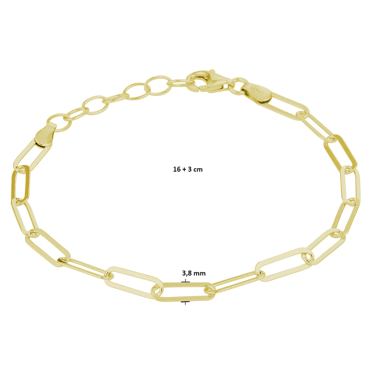 Verguld op 925 zilveren paperclip armband uitgevoerd met een karabijn sluiting. De armband heeft een draaglengte van 16cm en een extensie van 3cm. De schakelbreedte is 3.8mm. Geen garantie op plating.