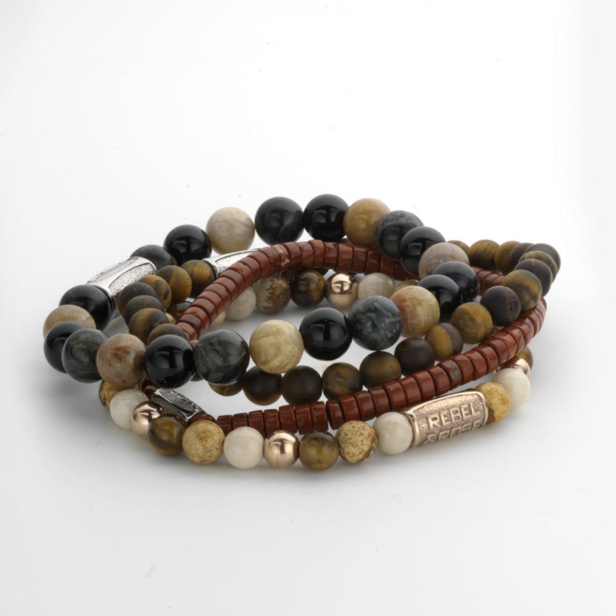 Edelstenen bead armband, handgemaakt van 8mm Ryoliet, Chrysant en zwarte Agaat stenen met een zilverkleurig slot.