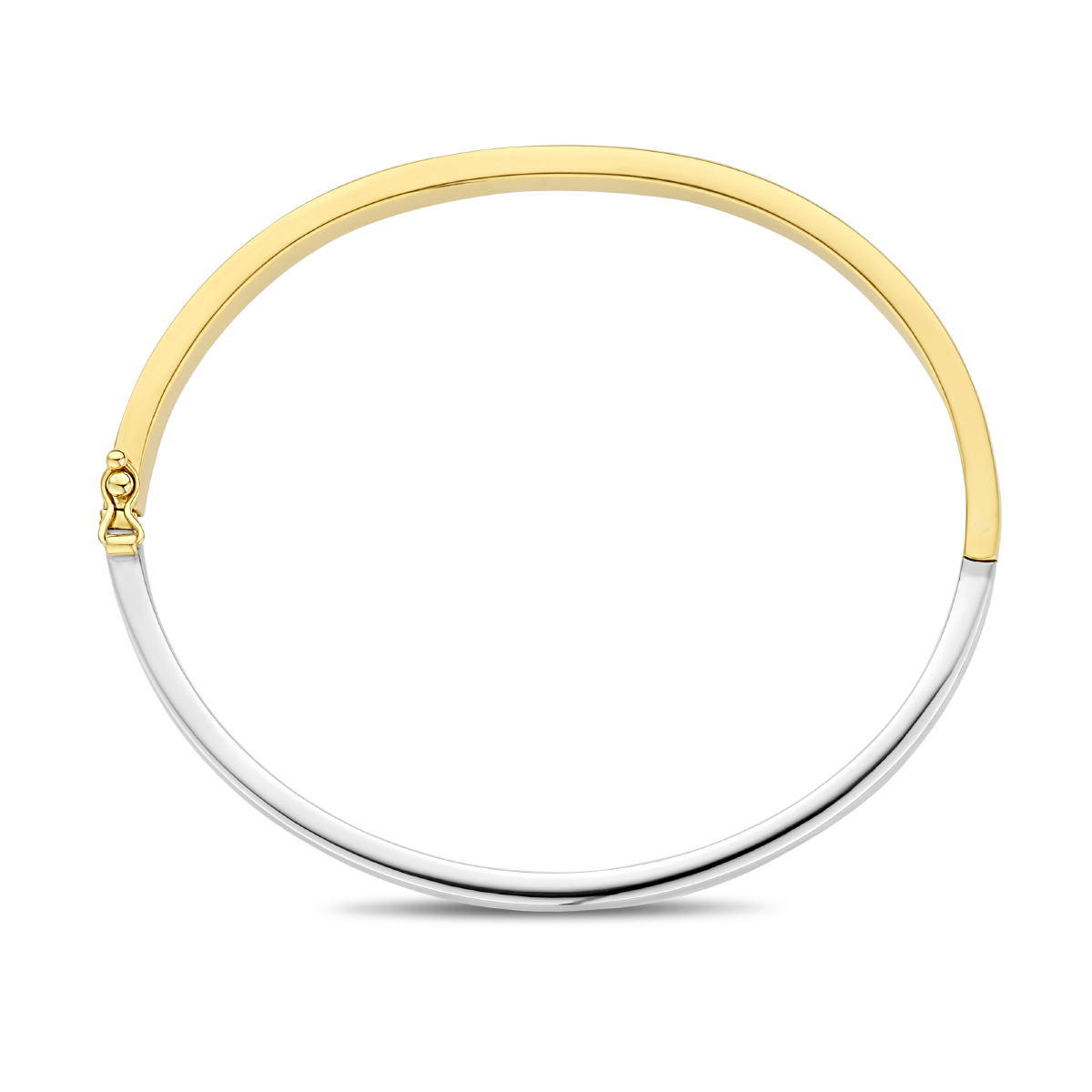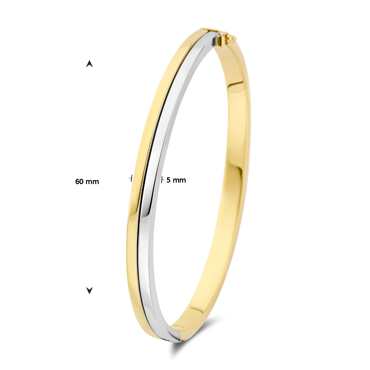 Deze bicolor bangle, modelnummer 4207610, heeft een diameter van 60 mm en een gewicht van 12,1 gram. Gemaakt van goud, met een glanzende afwerking en vlakke vorm, is het perfect te combineren met zowel casual als chique outfits. Draag hem solo of gestapeld voor een trendy uitstraling. Geschikt voor elke gelegenheid.