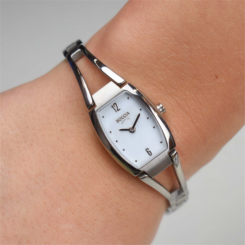 Dit dameshorloge van Boccia Titanium heeft een nette uitstraling. De zilverkleurige titanium horlogekast zorgt voor een stijlvolle look en de parelmoer wijzerplaat maakt het horloge chique. Het horloge heeft een rechthoekige kast met een diameter van 19mm, een mineraalglas en is 5ATM. Combineer dit prachtige exemplaar met de andere sieraden van Boccia Titanium voor een complete look. Aan de titanium kast zit een titanium opengewerkte bangle band.