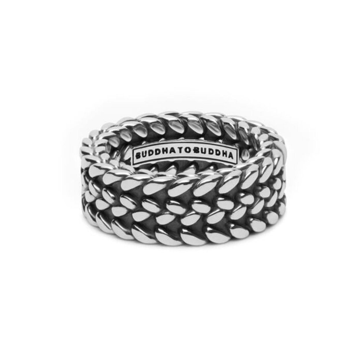 Buddha To Buddha black rhodium dubbel rij gevlochten 925 sterling zilveren fantasie ring met een zilveren logo plaatje. Model - 193 BRss-Julius in maat 20.