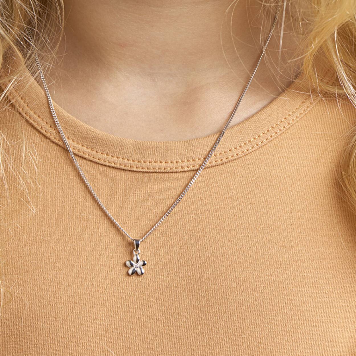 Schattig gerhodineerd zilveren kindercollier met een bloem hanger en een schitterende zirkonia. De lengte bedraagt 36cm met een 4cm extensie en de schakelbreedte is 1.1mm. Info: Gerhodineerd zilver is door de rhodiumlaag beter bestand tegen verkleuren en krassen.