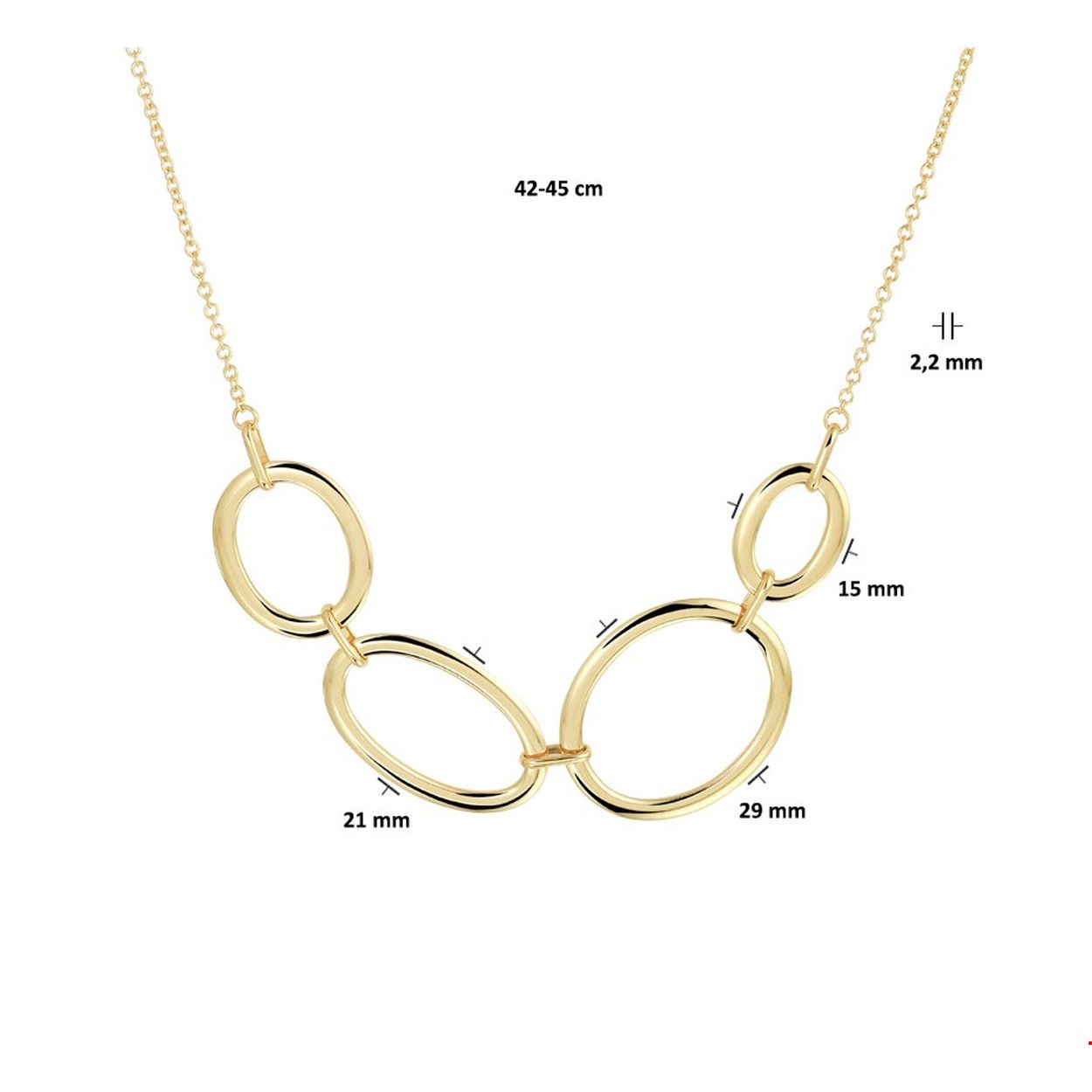 Dit collier met anker schakels van 2,2mm is een trendy aanvulling op je garderobe. De grote schakels hebben verschillende maten, de grootste is 29mm breed. Het collier heeft een verstelbare lengte van 42-45cm en valt rond de nek. Het 14k geelgoud is gepolijst en het collier heeft een stevige karabijnsluiting.