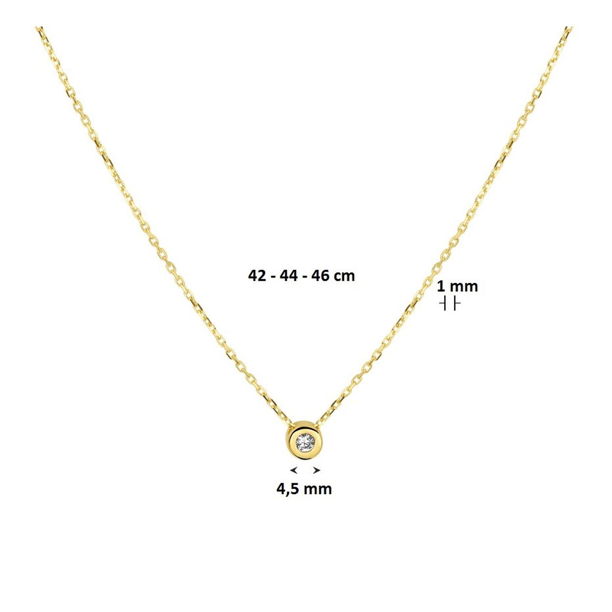 Klassiek 14k geelgouden 1mm anker collier met draaglengtes van 42cm 44cm en 46cm uitgevoerd met een briljant geslepen zirkonia in in zetkast van 4.5mm. Door het simplistische model is dit collier perfect te combineren met andere sieraden. Tip: Combineer dit collier met andere sieraden uit onze collectie of met sieraden vanuit je eigen stash en creeer zo elke keer weer een nieuwe look!