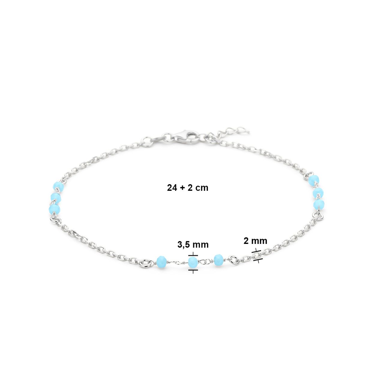 Gerhodineerd 925 zilveren enkelbandje uitgevoerd met blauw kristal bolletjes. Het enkelbandje heeft een draaglengte van 24cm en een extensie van 2cm. Uitgevoerd met een karabijn sluiting.