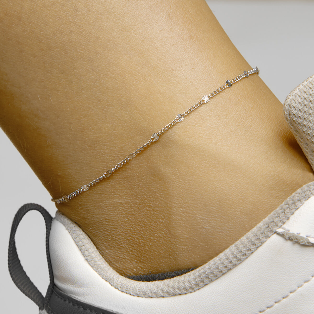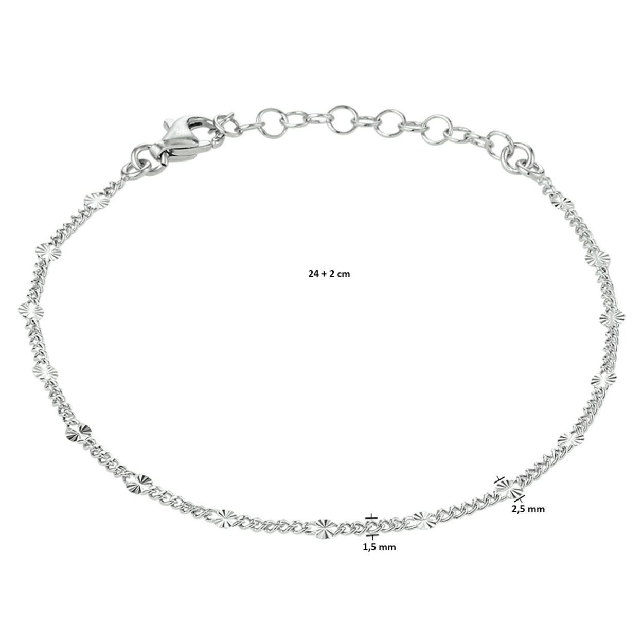 Gerhodineerd 925 zilveren enkelbandje uitgevoerd met een gourmet schakel en plaatjes. Het enkelbandje heeft een draaglengte van 24cm met een extensie van 2cm. De plaatjes hebben en breedte van 2.5mm. De schakelbreedte is 2.5mm.