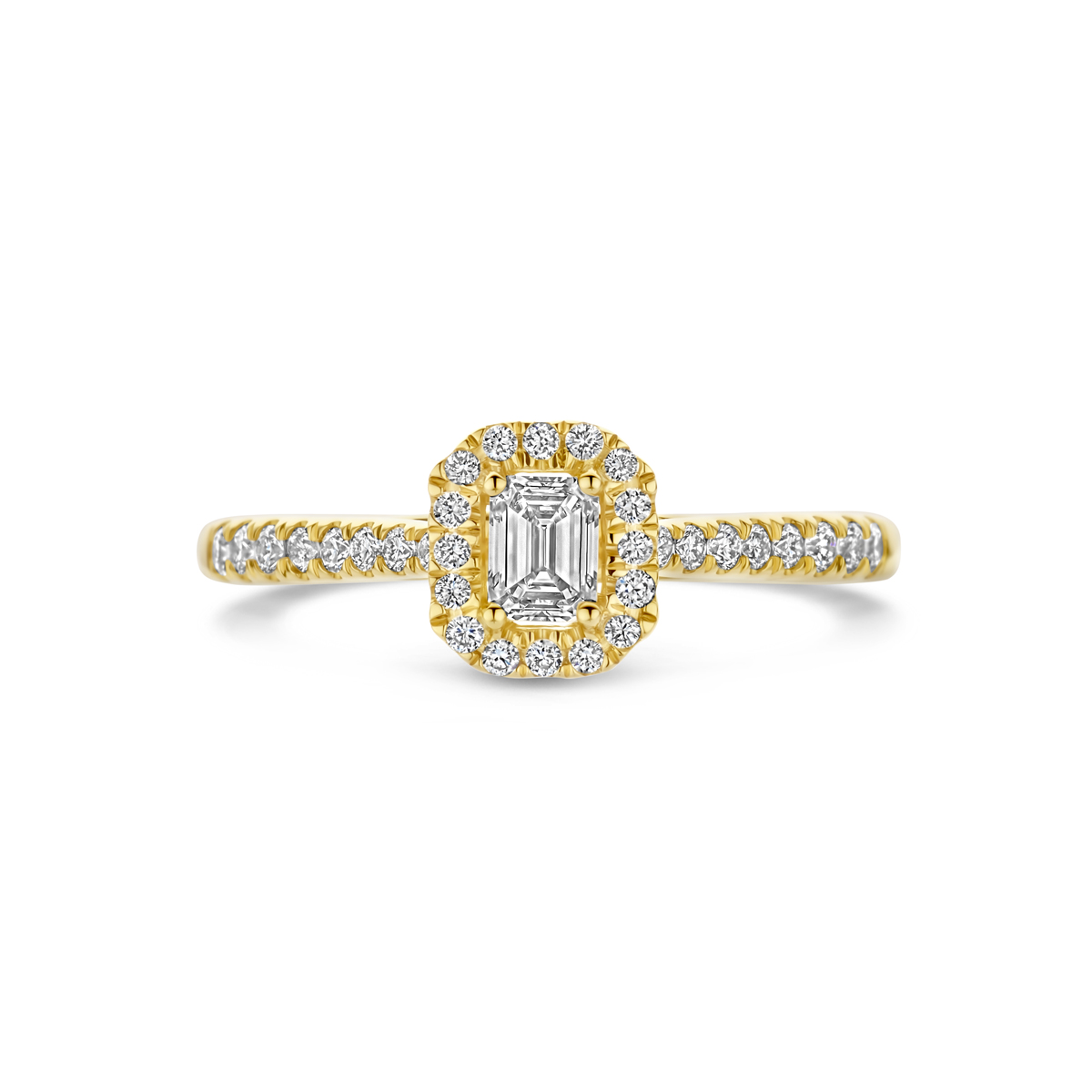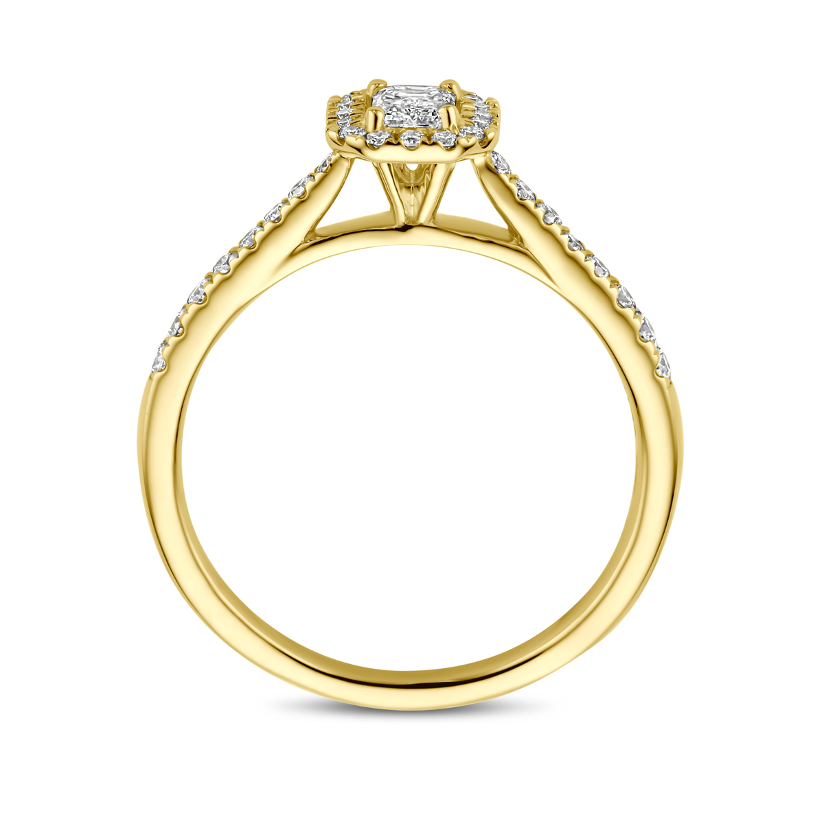 14k Geelgouden ring uitgevoerd met lab grown diamant. De ring heeft een breedte van 7mm. Het totale diamantgewicht is 0.48ct. Lab grown diamanten zijn diamanten die ontstaan in een laboratorium. Onder extreem hoge druk en temperatuur wordt het natuurlijk ontstaansproces nagebootst met als eindresultaat een diamant met dezelfde chemische eigenschappen maar met een andere oorsprong.