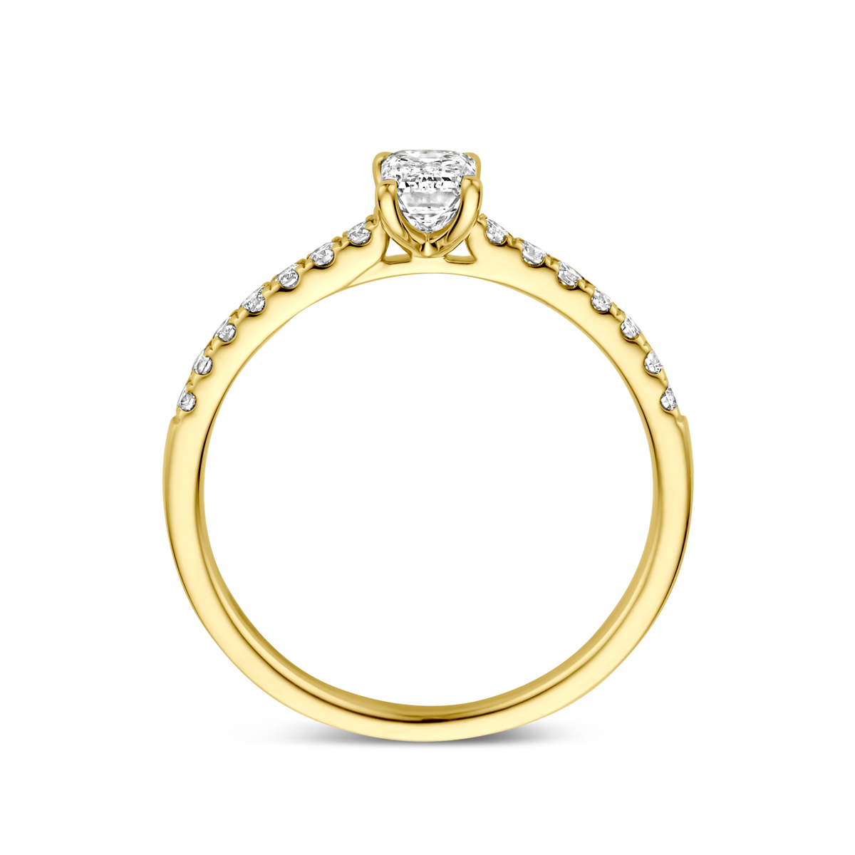 14k Geelgouden ring uitgevoerd met lab grown diamant. De steen heeft een afmeting van 5,5x4,0mm. Het totale diamantgewicht is 0.58ct. Lab grown diamanten zijn diamanten die ontstaan in een laboratorium. Onder extreem hoge druk en temperatuur wordt het natuurlijk ontstaansproces nagebootst met als eindresultaat een diamant met dezelfde chemische eigenschappen maar met een andere oorsprong.