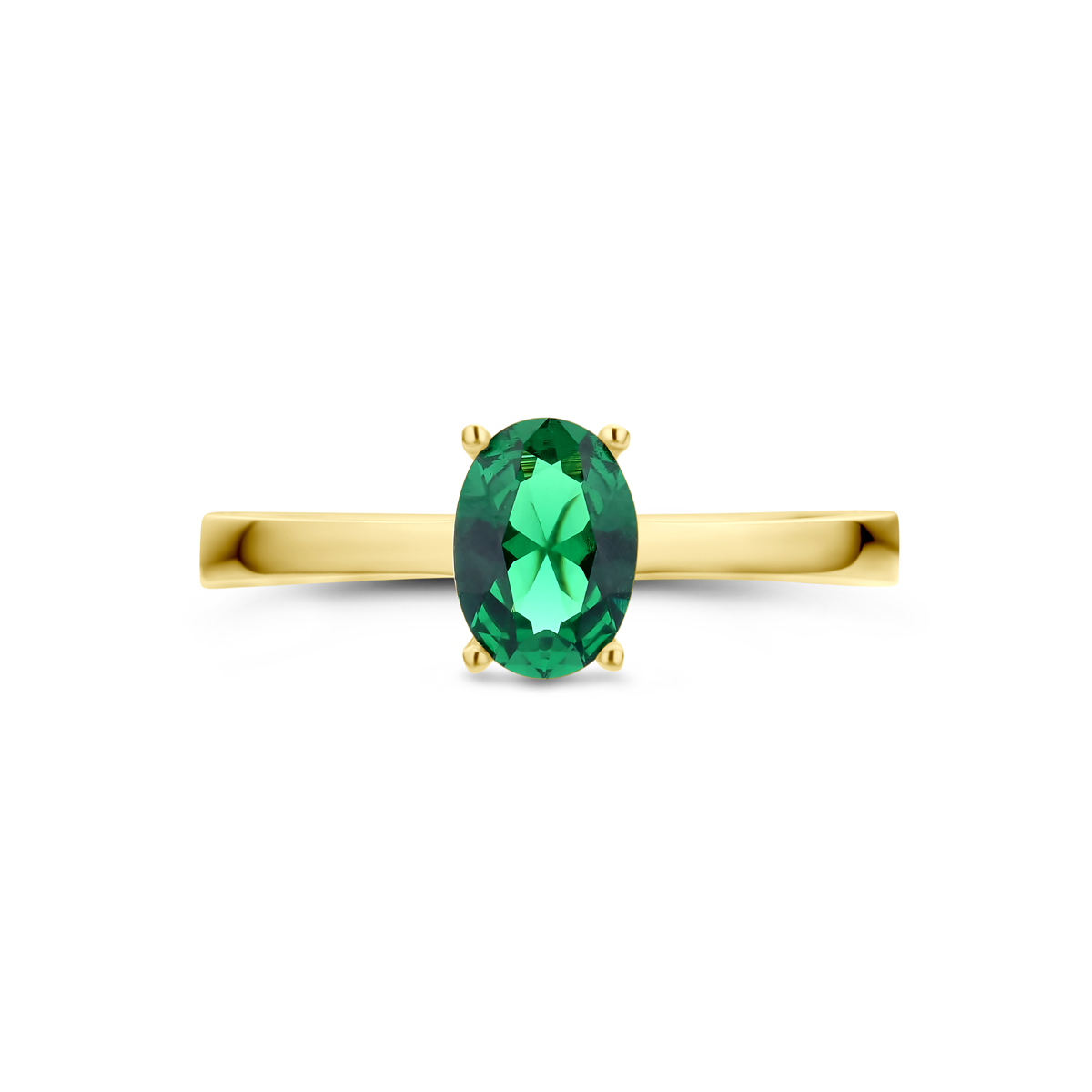 14k Geelgouden ring uitgevoerd met groen zirkonia. De ring heeft een breedte van 7mm.