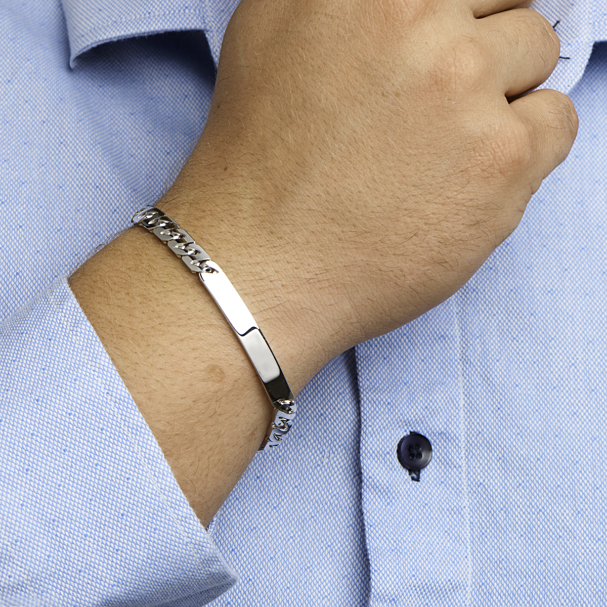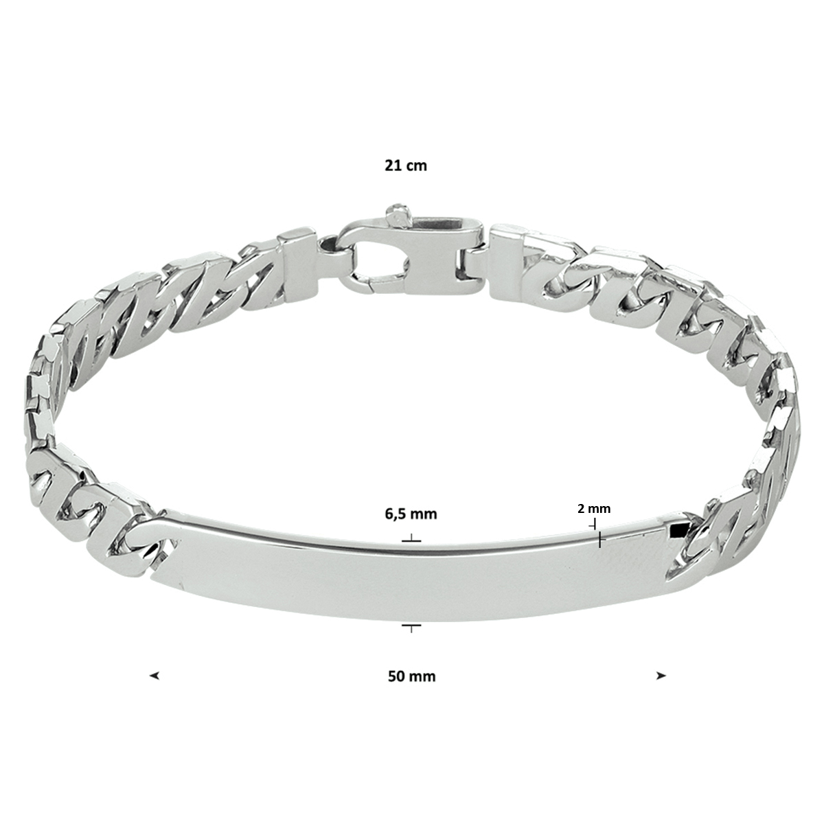 Gerhodineerd zilveren graveerarmband uitgevoerd met een stevige karabijn sluiting. De graveerplaat heeft een breedte van 6.5mm en een dikte van 2mm. De schakelbreedte is 6.5mm.