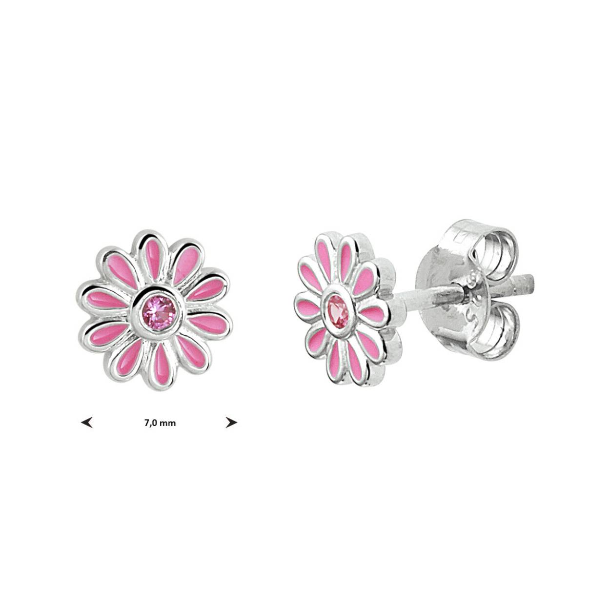 Gerhodineerd 925 zilveren oorknoppen uitgevoerd in de vorm van een bloem met een schitterende roze zirkonia. De oorknoppen hebben een diameter van 7mm.