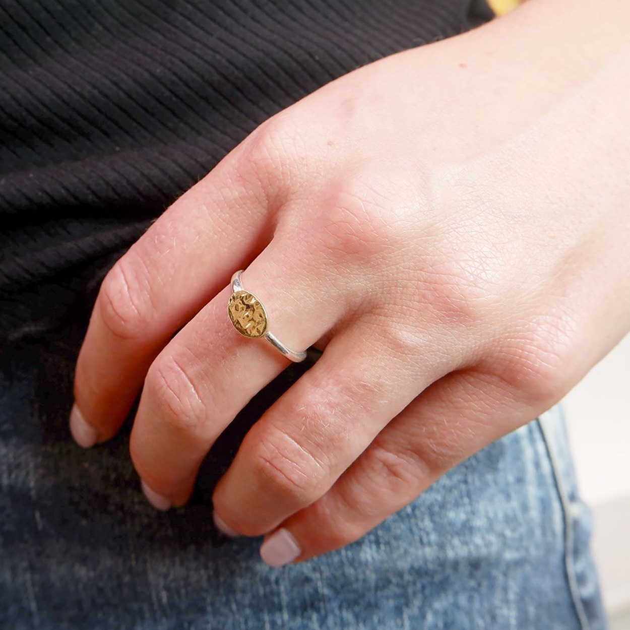 Ring van Jéh Jewels gemaakt van zilver en 9 karaat. Deze ring is een combinatie van 925 sterling zilver met een 9 karaat ovaaltje aan de bovenkant. Hij is leuk te combineren met de andere ringen uit de nieuwe najaarscollectie.