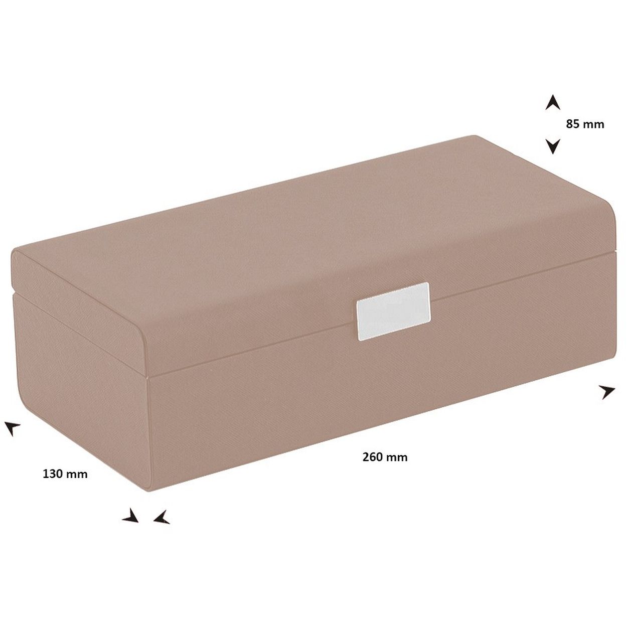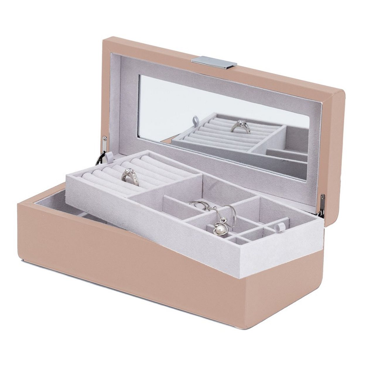 Luxe sieradenbox in de kleur beige uitgevoerd met stevige scharnieren, magnetische sluiting en een klein spiegeltje. De doos heeft een uitneembaar vak met vakjes in verschillende groottes. Een compacte box om verschillende sieraden in op te bergen.