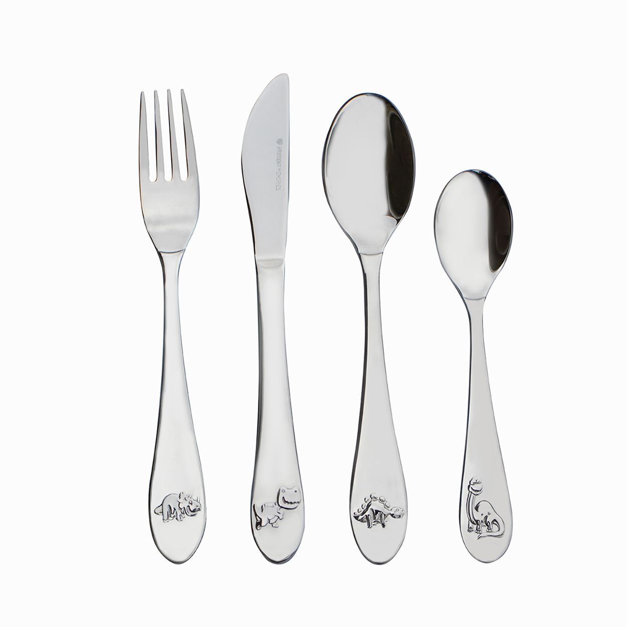 Stalen kinderbestek in een 4-delige set. De set bestaat uit: een mes van 190x18mm, een vork van 172x22mm, een lepel van 170x34mm en een dessertlepel van 140x28mm.