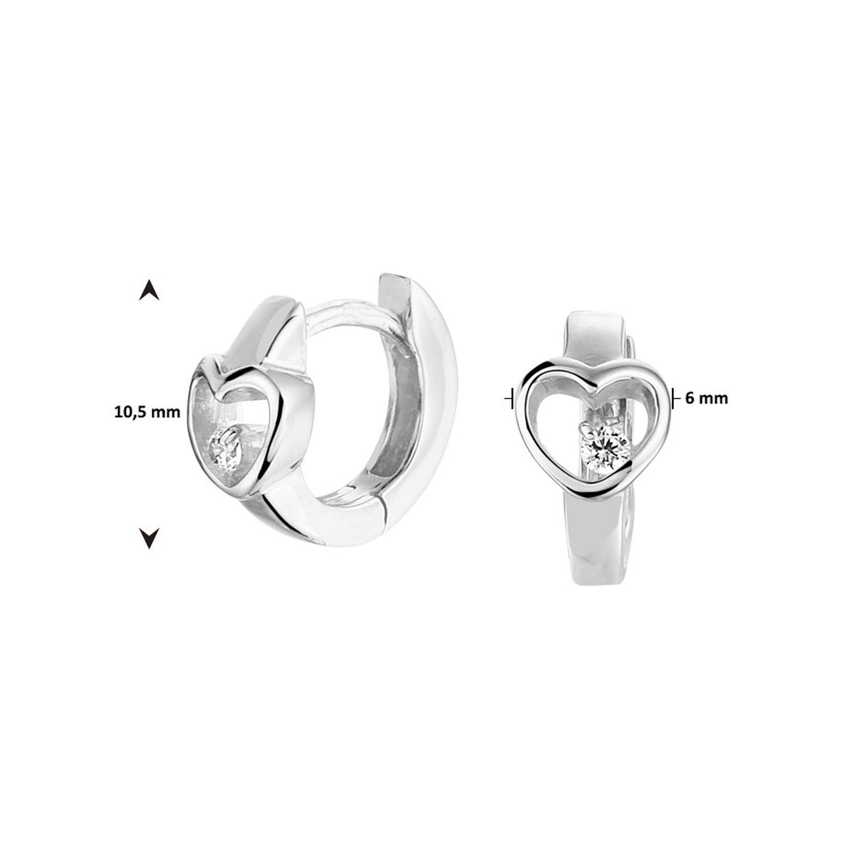 Gerhodineerd 925 zilveren klapoorringen uitgevoerd met een hartje en een heldere zirkonia. De oorringen hebben een afmeting van 10.5x6mm.