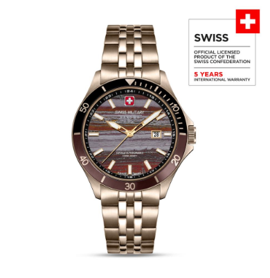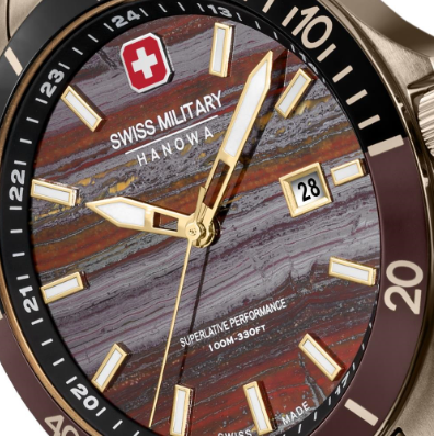 De Limited Edition Swiss Military Hanowa Flagship Tiger Iron (model SMWGH0008310) is een exclusief horloge met slechts 500 stuks wereldwijd. Het heeft een roestvrijstalen kast van 42 mm, een goudkleurige horlogeband en een datumaanduiding. Draag het als een statement piece bij formele outfits voor een stijlvolle en tijdloze uitstraling.