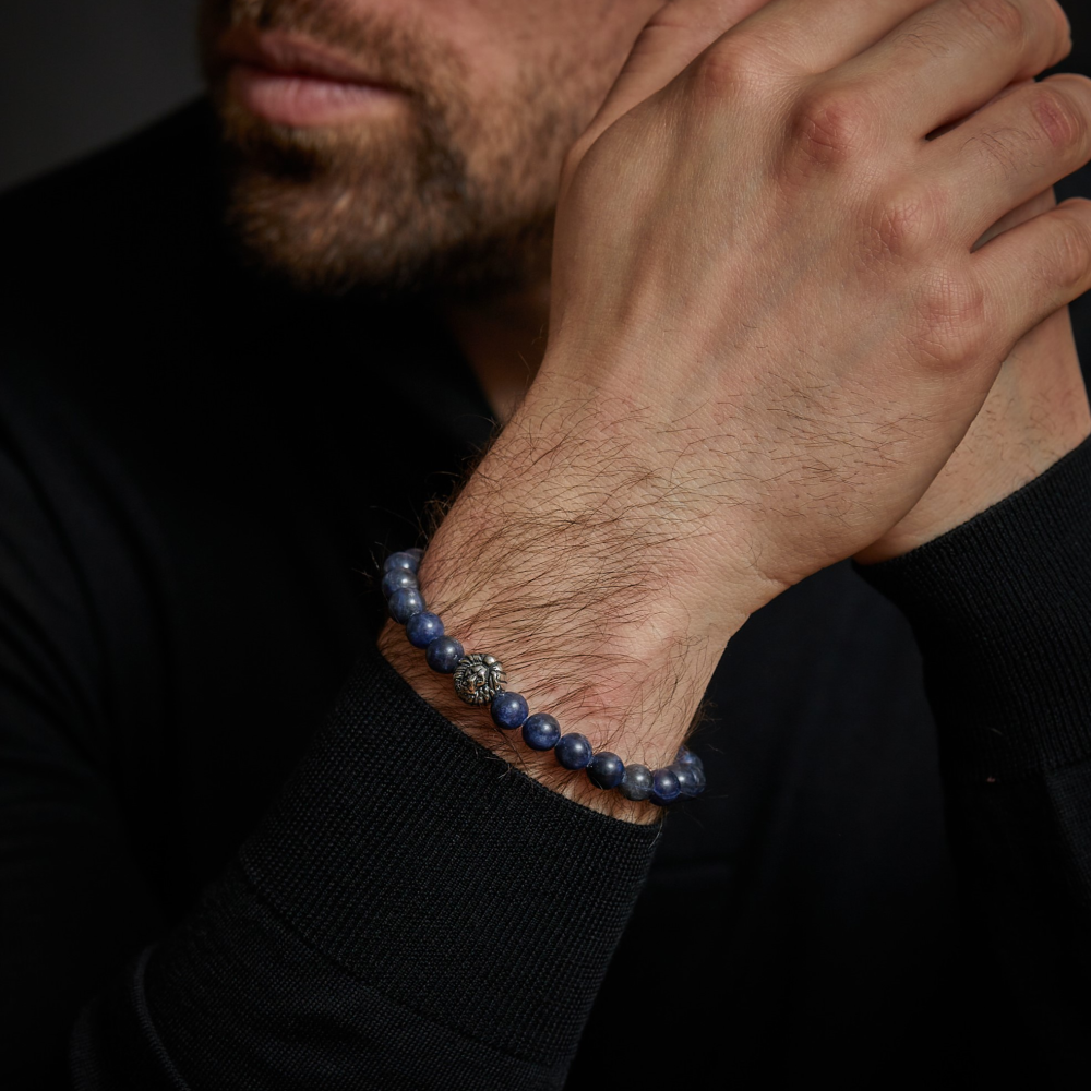 Bead armband, handgemaakt van 8mm blauwe Sodaliet stenen met een antiek-look Lionhead en sluiting. Het Rebel & Rose sieraad is makkelijk te combineren met andere zilveren, leren of kralenarmbanden.