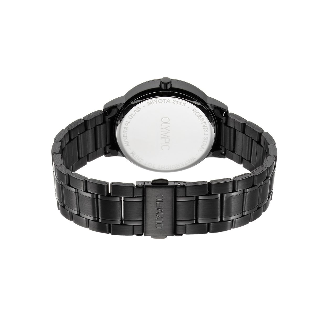 Dit unieke Olympic horloge met artikelnummer: OL80HZZ001 is een herenhorloge met een classic sportieve uitstraling. Het horloge heeft een ronde stalen zwarte kast met een zwarte wijzerplaat en een datum. Aan de kast zit een stalen zwarte schakelband met vouwsluiting. Het horloge heeft een mineraalglas, een doorsnee van 37mm en is 5ATM.