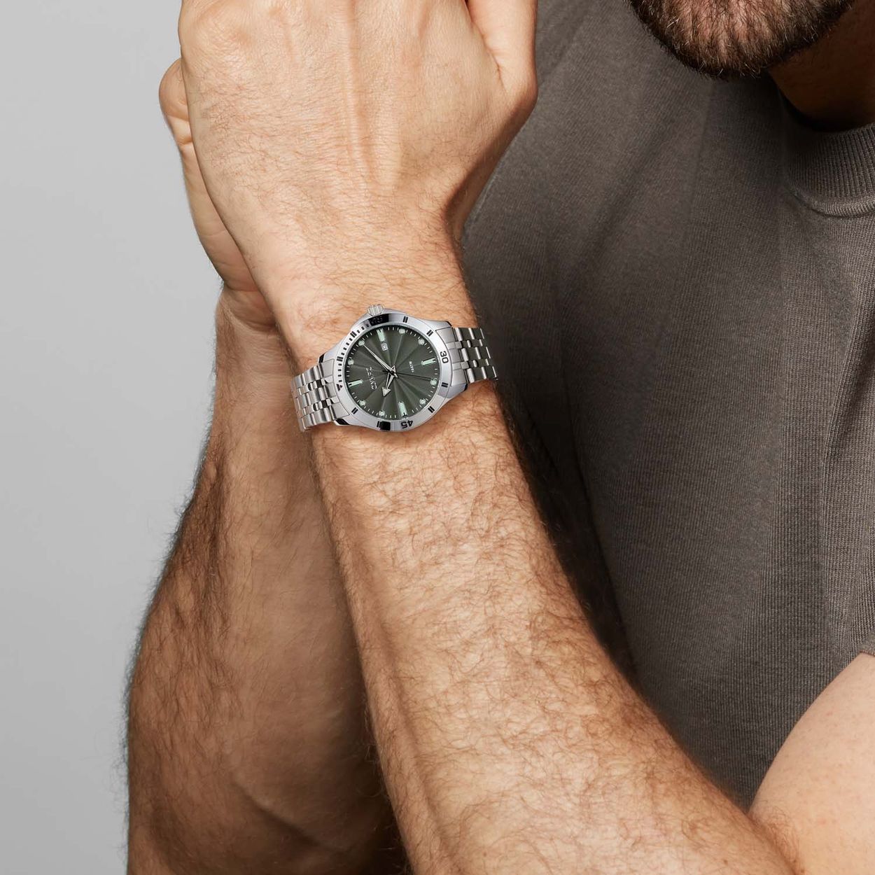 Dit unieke Olympic horloge met artikelnummer: OL72HSS408 is een herenhorloge met een classic sportieve uitstraling. Het horloge heeft een ronde stalen kast met een groene wijzerplaat met een datum, witte strepen en stippen ingelegd met lumibrite. Aan de kast zit een stalen schakelband met vouwsluiting. Het horloge heeft een mineraalglas, een doorsnee van 41mm en is 10ATM.