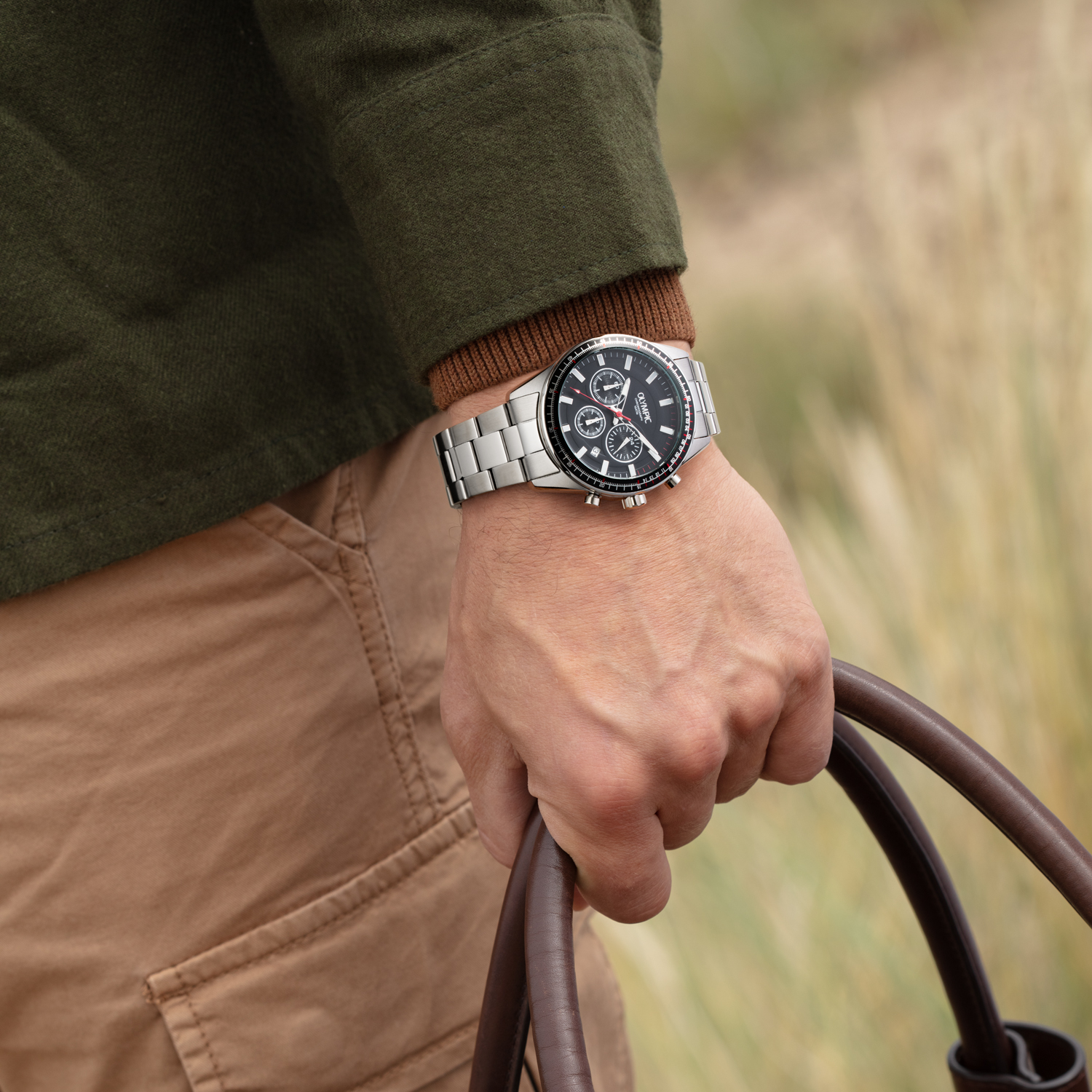 Dit unieke Olympic horloge met artikelnummer: OL72HSS287 is een herenhorloge met chronograaf en heeft een sportieve uitstraling. De stalen kast heeft een zwarte bewerkte bezel en een zwarte wijzerplaat met een datum en chronograaf. De uursaanduiding is opvallend door de lumibrite strepen en wijzers. De rode accenten geven het horloge een sportief uiterlijk. Aan de stalen kast zit een stalen schakelband met een vouwsluiting. Het horloge heeft een mineraalglas, een doorsnee van 44mm en is 10ATM.