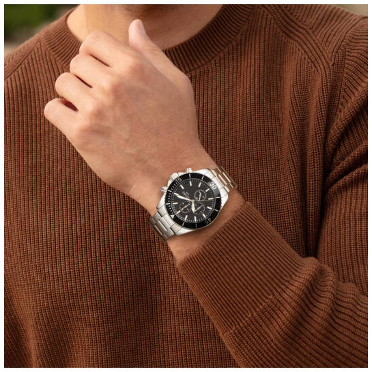 Dit unieke Olympic horloge met artikelnummer: OL89HSS054 is een heren horloge met een stoere uitstraling. De stalen kast heeft een bewerkte bezel en een zwarte wijzerplaat met een chronograaf. De uursaanduiding is opvallend door de lumibrite strepen en wijzers. Dit geeft het horloge een stoer uiterlijk. Aan de stalen kast zit een stalen mat glimmende schakelband met een vouwsluiting. Het horloge heeft een mineraalglas, een doorsnee van 43mm en is 10ATM.