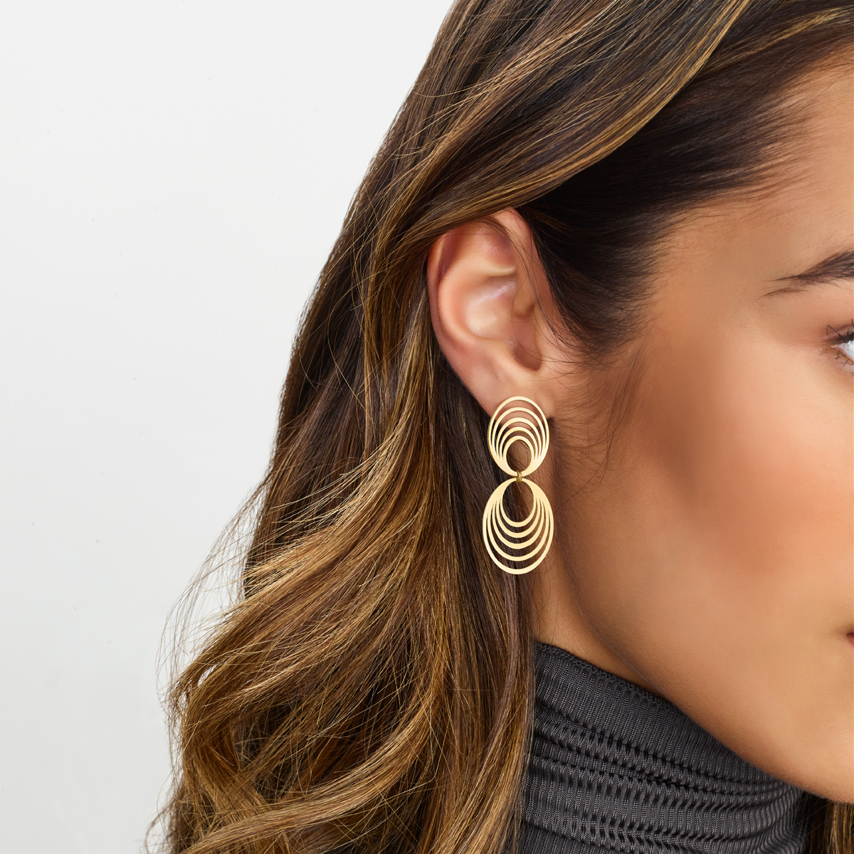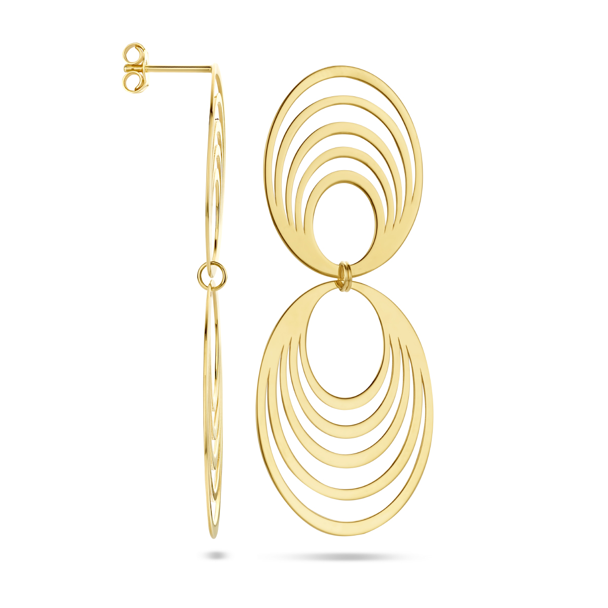 14k Geelgouden oorhangers uitgevoerd met open rondjes. De oorhangers hebben een totale hoogte van 55mm.
