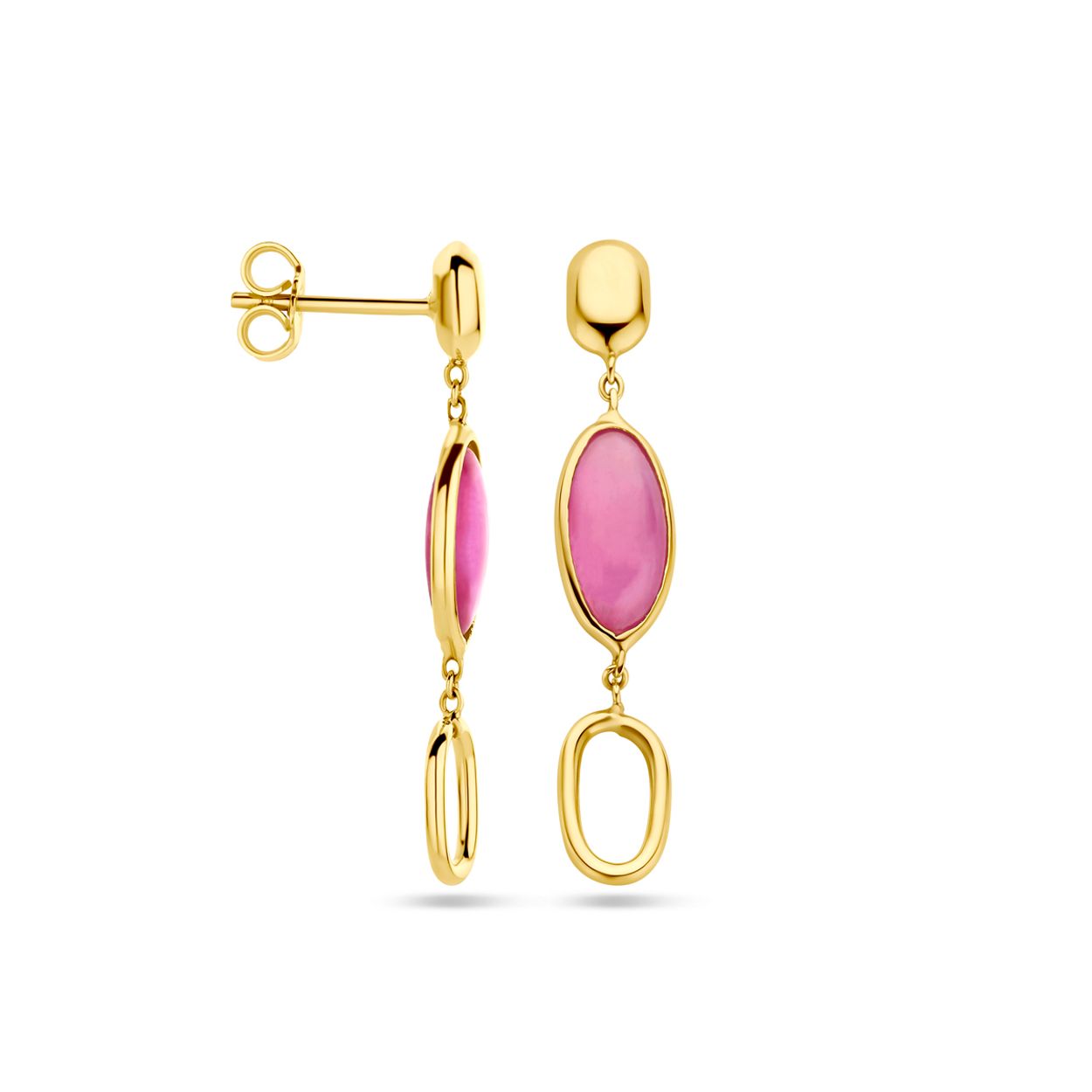 14k Geelgouden oorhangers uitgevoerd met robijn. De oorhangers hebben een totale hoogte van 30mm.