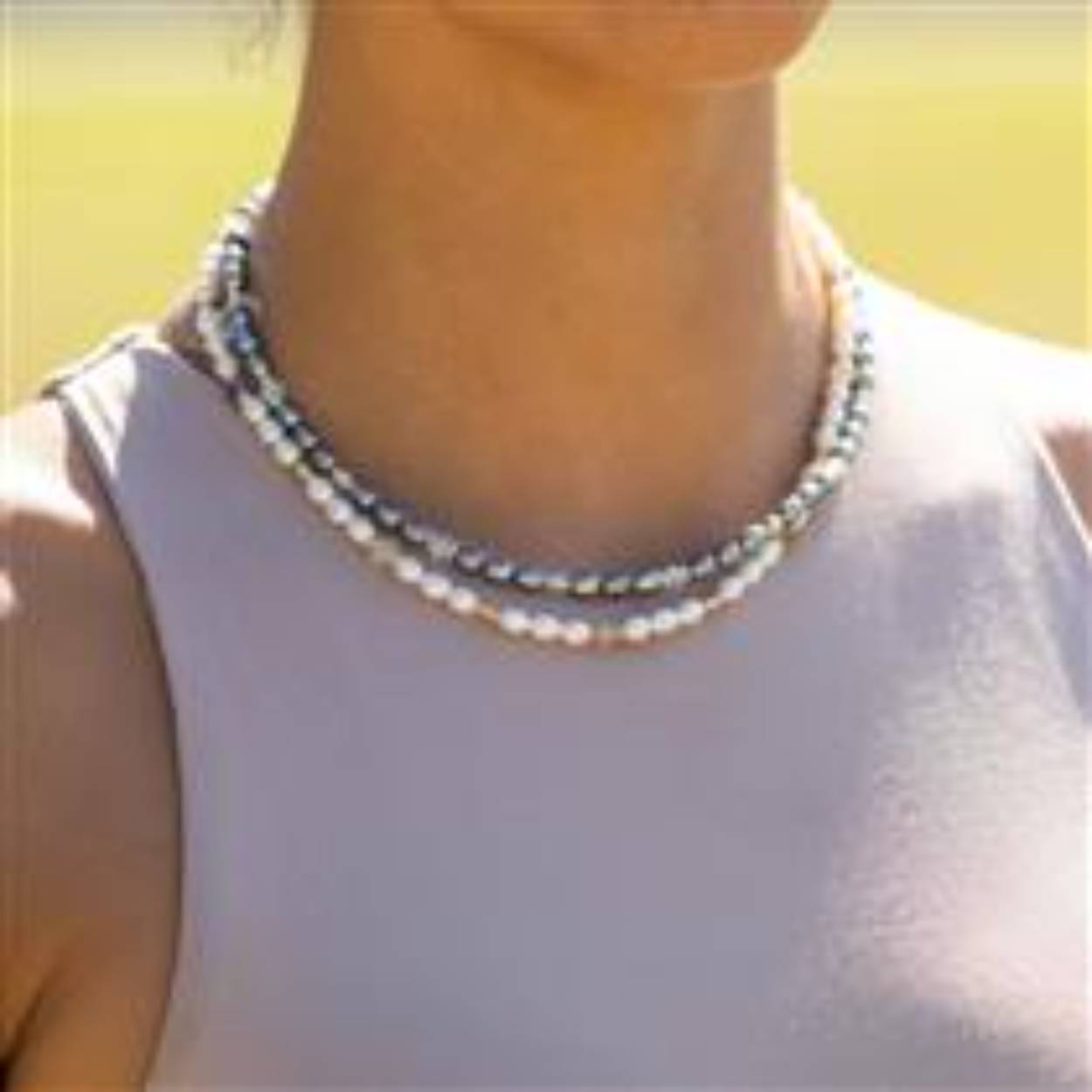 Deze geel goud vergulde ketting is versierd met een 2mm gefacetteerde citrien, een 2 mm carneool, een 2 mm amethist, 2 mm rozenkwarts, een 2mm groene toermalijn kwarts en een 2 mm aquamarijn. tussen de steentjes door zitten 6 à 6,5 mm witte parels. De ketting heeft een lengte van 45 cm.