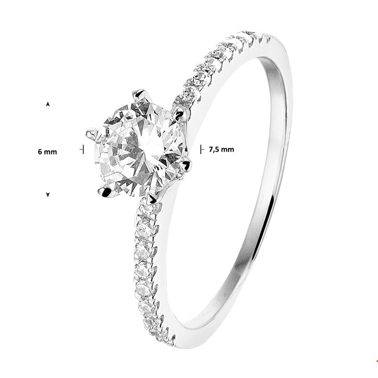 Beschrijving: Gerhodineerd zilveren ring uitgevoerd met een chaton en een rij met heldere zirkonia. Door de eenvoud en het verfijnde ontwerp kan deze ring perfect worden gedragen met andere sieraden. Info: Gerhodineerd zilver is door de rhodiumlaag beter bestand tegen verkleuren en krassen.