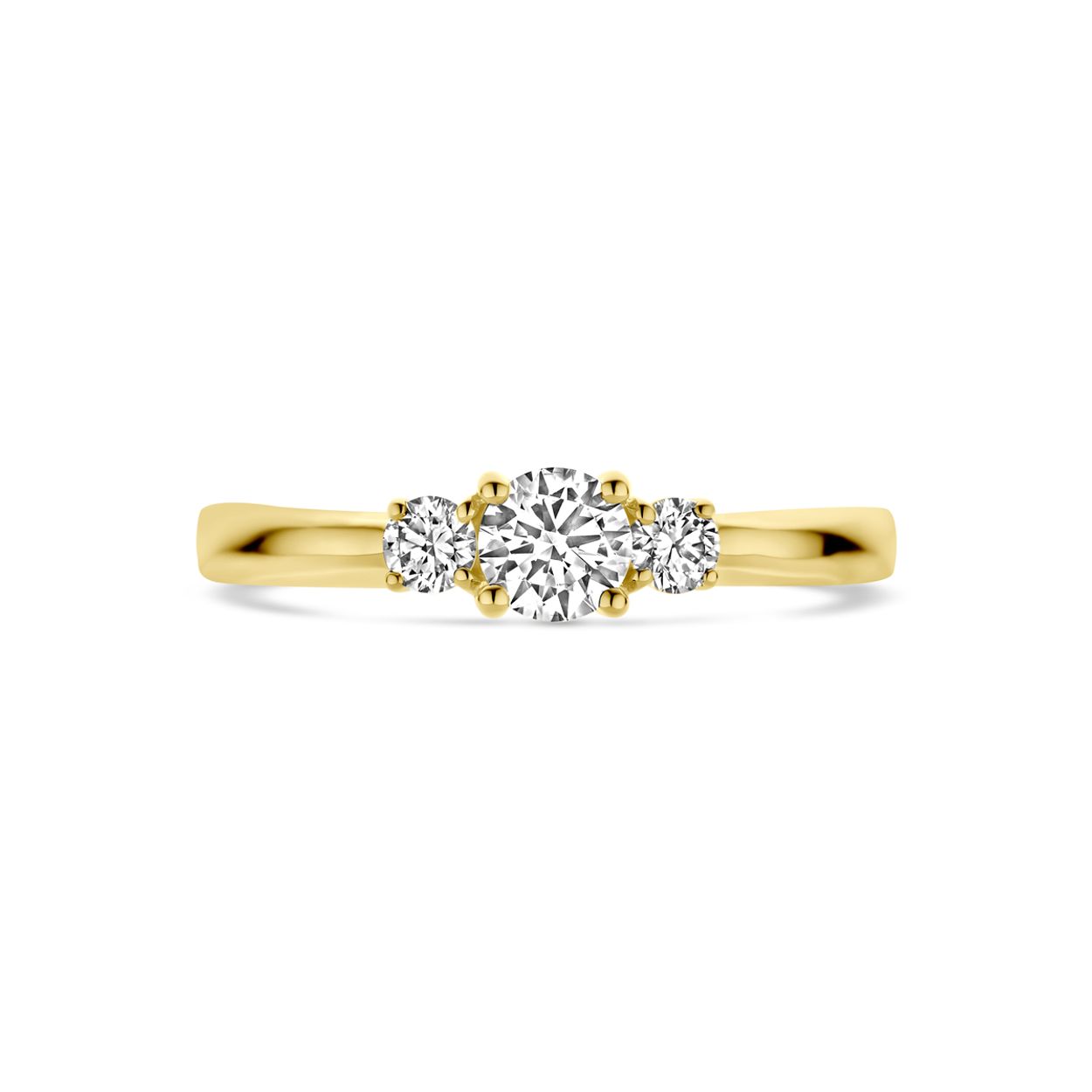 14k Geelgouden ring uitgevoerd met lab grown diamanten. De ring heeft een breedte van 4.5mm en het diamantgewicht is 0.46ct. Lab grown diamanten zijn diamanten die ontstaan in een laboratorium. Onder extreem hoge druk en temperatuur wordt het natuurlijk ontstaansproces nagebootst met als eindresultaat een diamant met dezelfde chemische eigenschappen maar met een andere oorsprong.