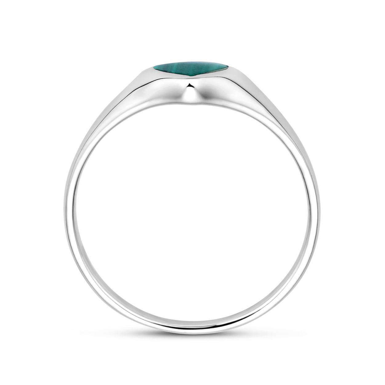 Gerhodineerd 925 zilveren ring uitgevoerd in de vorm van een hartje met malachiet. De ring heeft een breedte van 6mm.