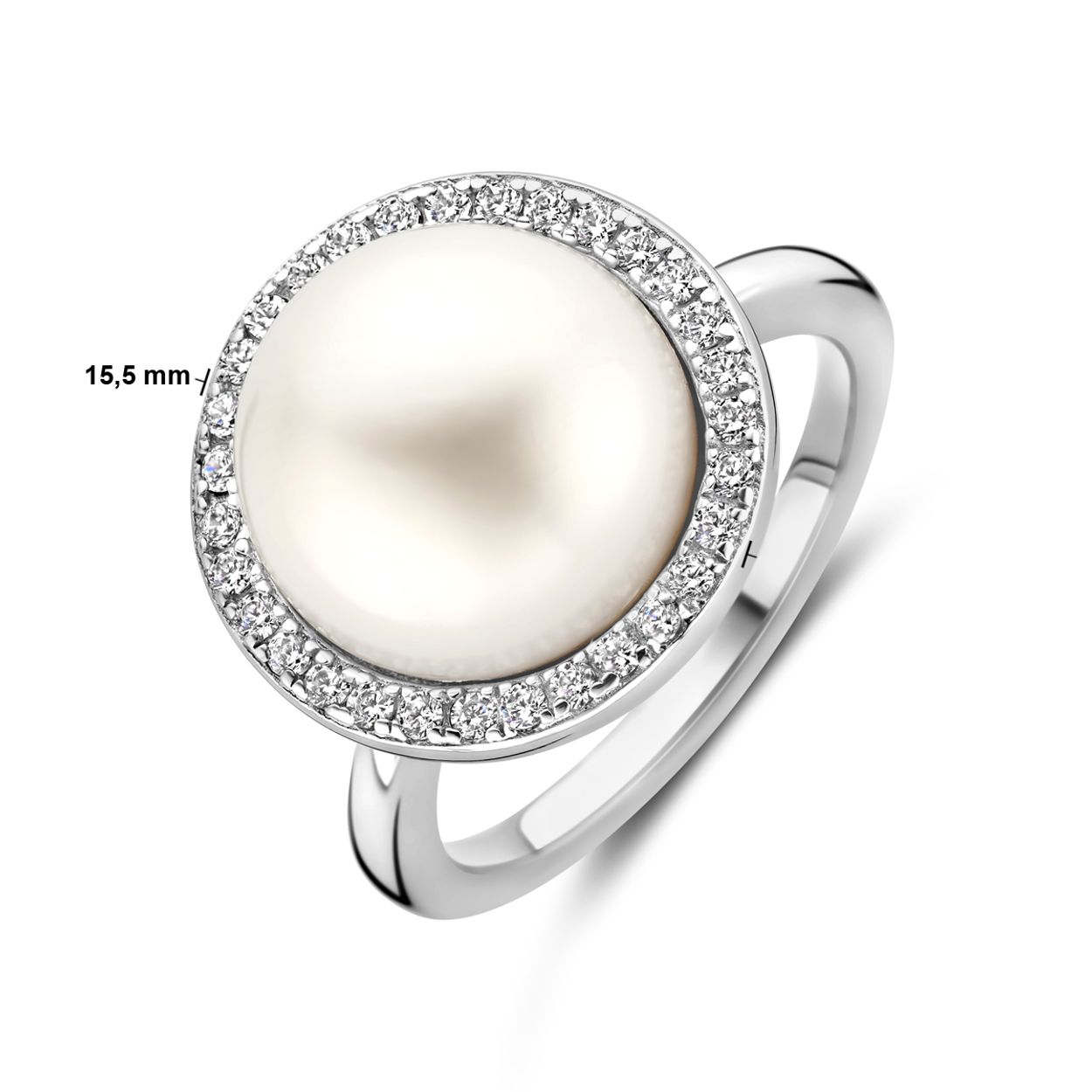 Gerhodineerd 925 zilveren ring uitgevoerd met zirkonia en een zoetwaterparel van 12mm.