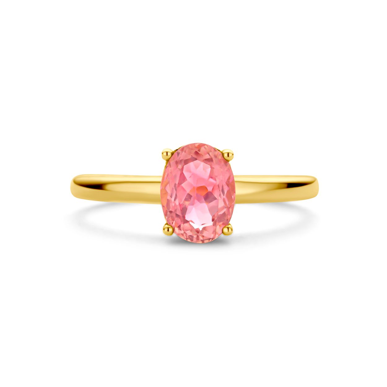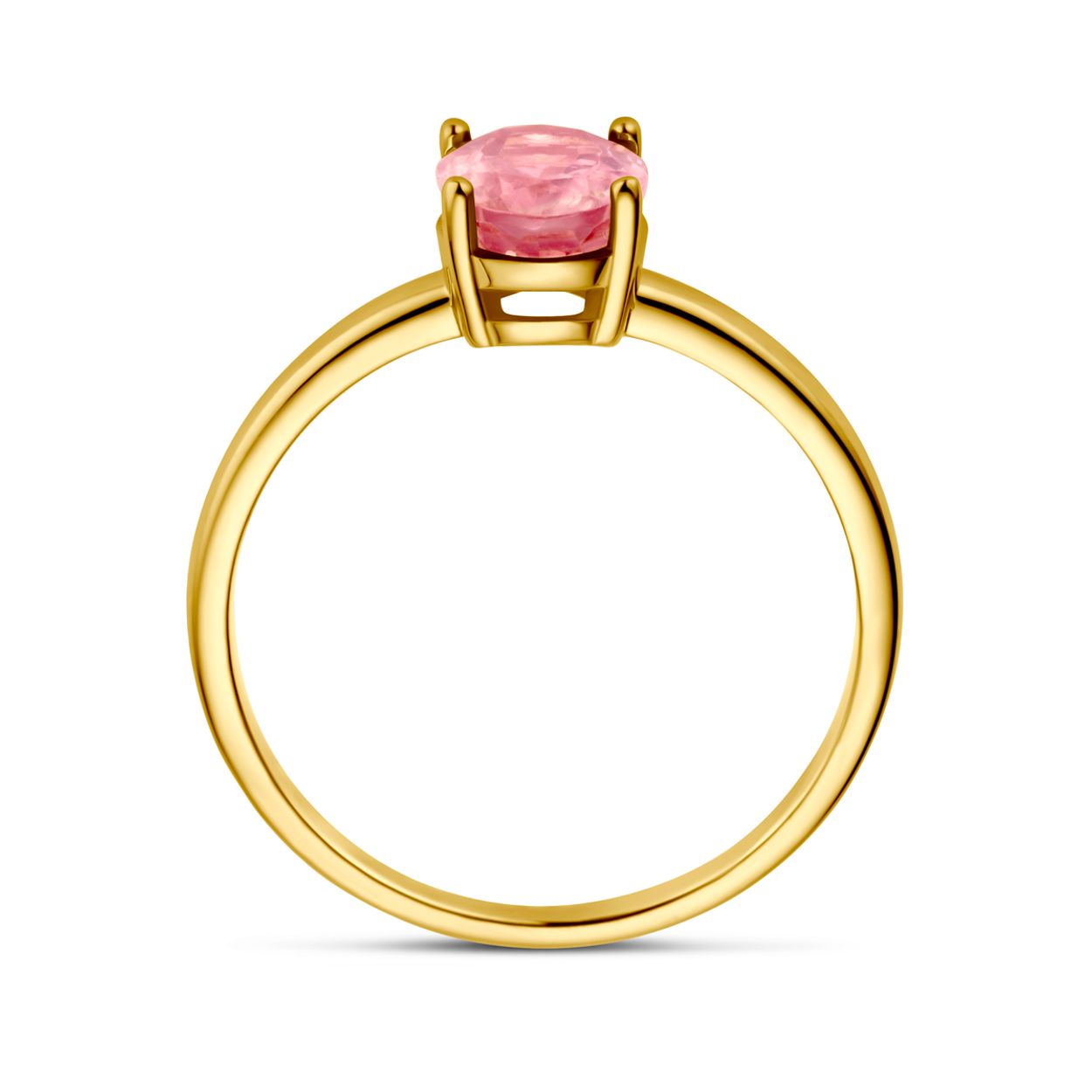 14k Geelgouden ring uitgevoerd met roze toermalijn. De steen heeft een afmeting van 8x6mm.