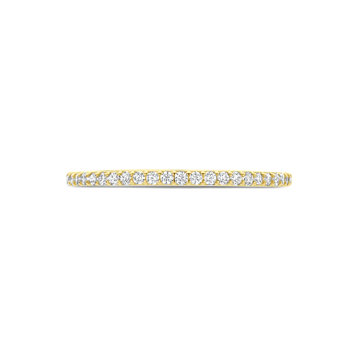 14k Geelgouden ring uitgevoerd met zirkonia. De ring heeft een breedte van 1.3mm.
