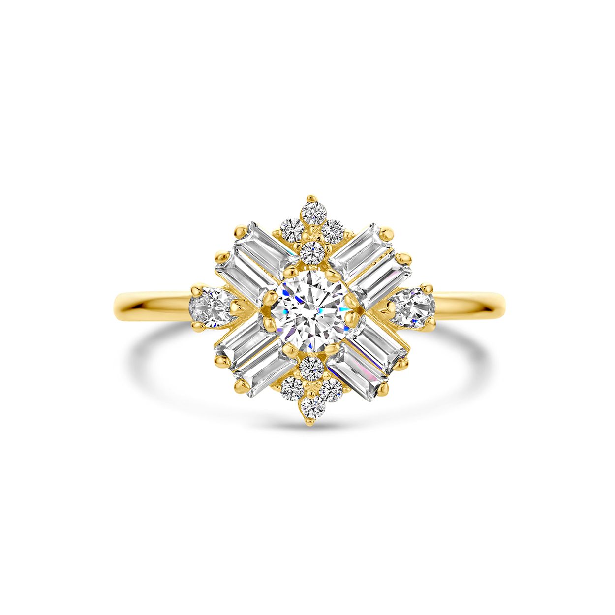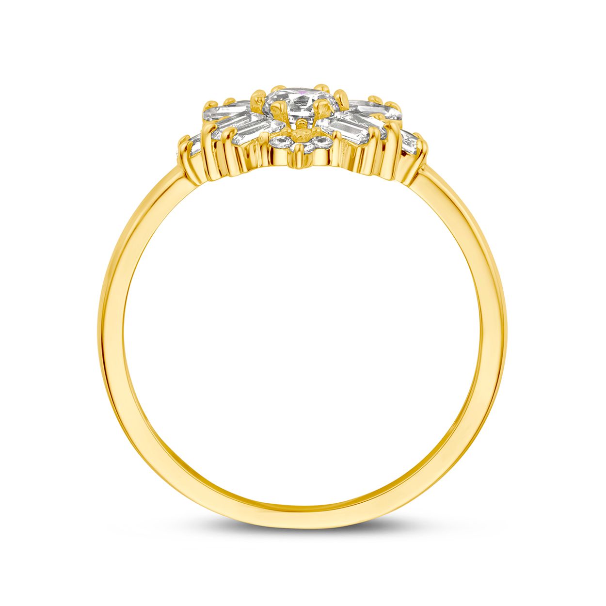 14k Geelgouden ring uitgevoerd met zirkonia. De ring heeft een breedte van 11.5mm.