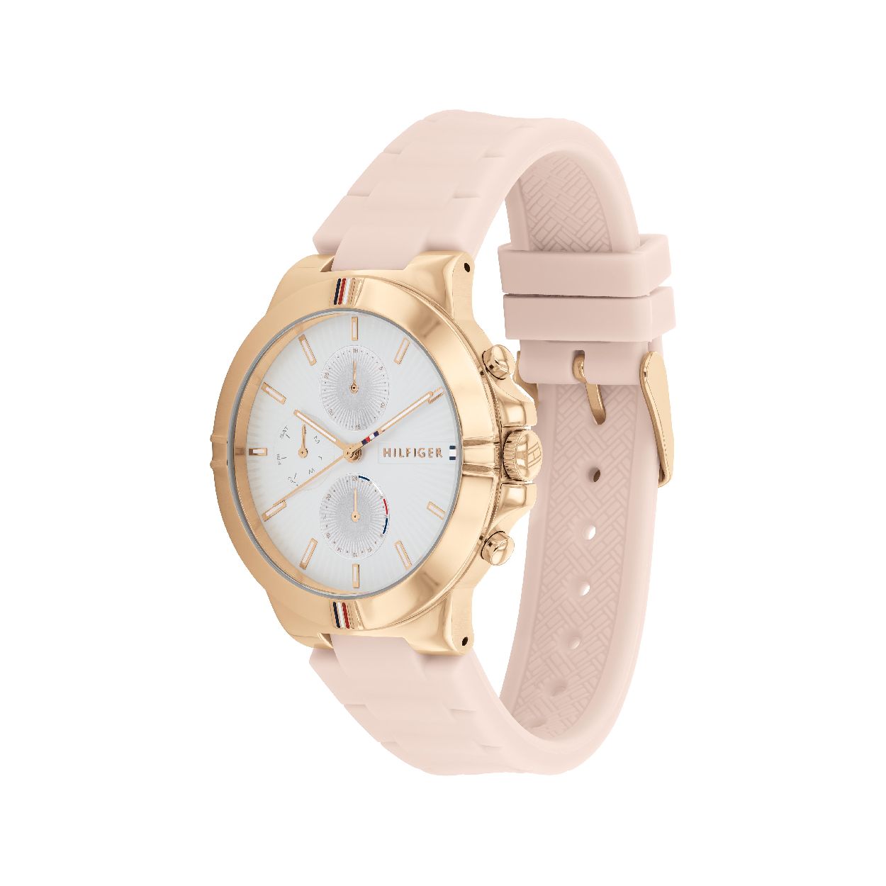 Dit ros�kleurige Tommy Hilfiger horloge �TH1782334� is sportief en vrouwelijk, maar met een attitude. De steentjes in de horlogekast geven een elegante draai aan deze sportieve stijl. De horlogeband is roze en met zijn ros�kleurige horlogekast en elegante multifunctionele wijzerplaat is dit horloge een absolute must en maakt iedere look compleet!