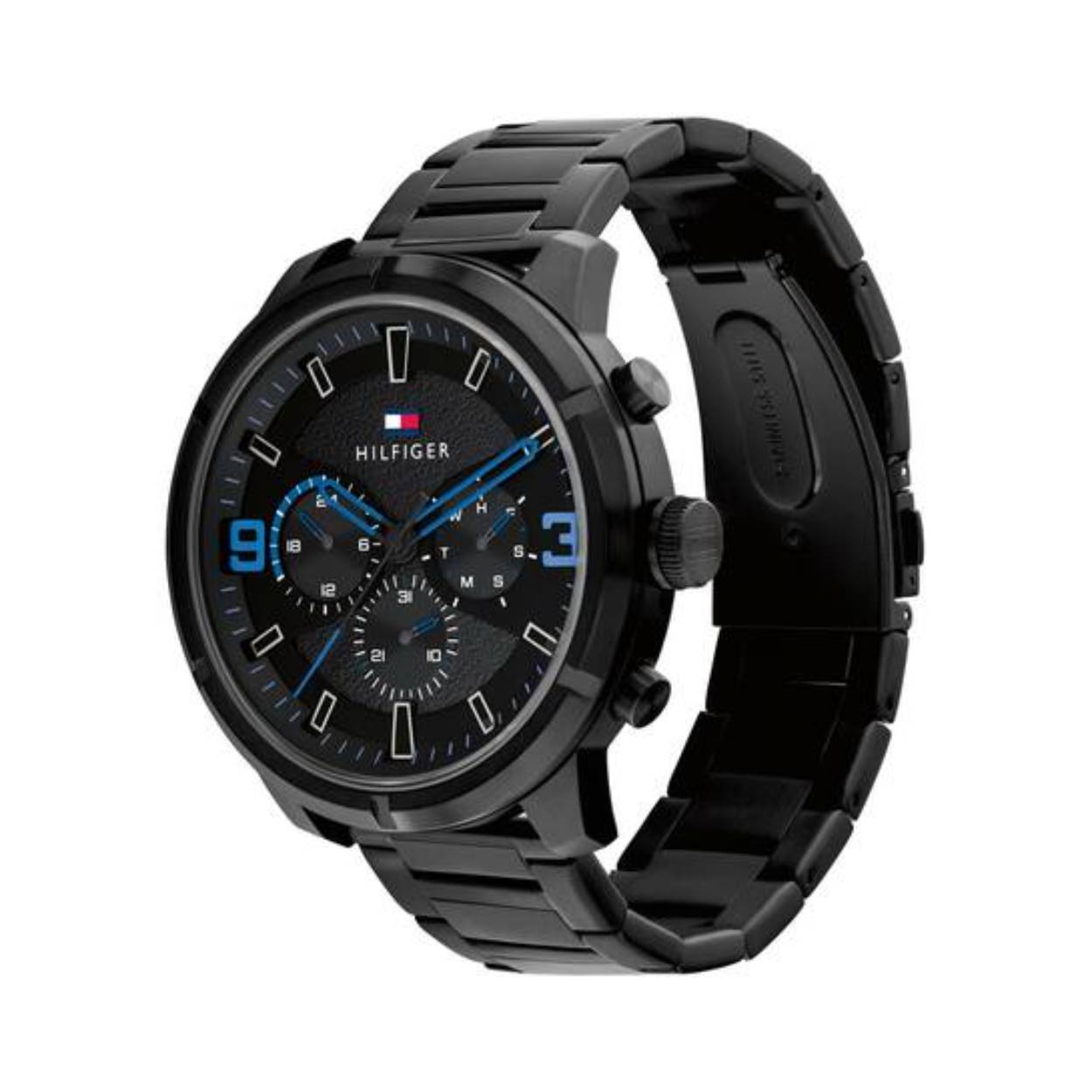 Dit specifieke horloge van Tommy Hilfiger met artikelnr: TH1792070 is een stoer herenhorloge die je zeker aan je collectie kan toevoegen. Het stalen herenhorloge heeft een ronde zwarte kast met een zwarte bezel en een zwarte wijzerplaat met daarop de dag.- datum en 24-uursaanduiding en blauwe accenten. Aan de kast zit een zwarte schakel band met vouwsluiting. Het horloge heeft een mineraalglas, een doorsnee van 50mm en is 5 ATM.