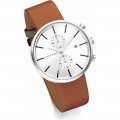 De wijzers zijn van gepolijst staal en aan het horloge zit een bruin lederen horlogeband. De diameter van de horlogekast is 42 millimeter.