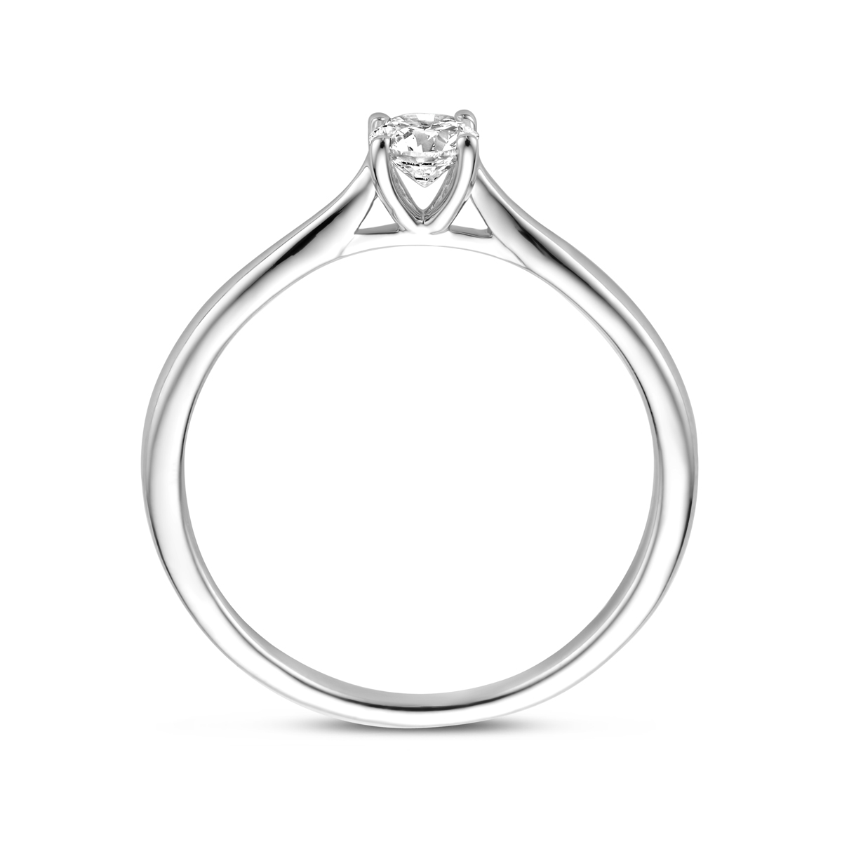 14k Witgouden ring uitgevoerd met lab grown diamant. De ring heeft een breedte van 4mm. Het diamantgewicht is 0.25ct. Lab grown diamanten zijn diamanten die ontstaan in een laboratorium. Onder extreem hoge druk en temperatuur wordt het natuurlijk ontstaansproces nagebootst met als eindresultaat een diamant met dezelfde chemische eigenschappen maar met een andere oorsprong.