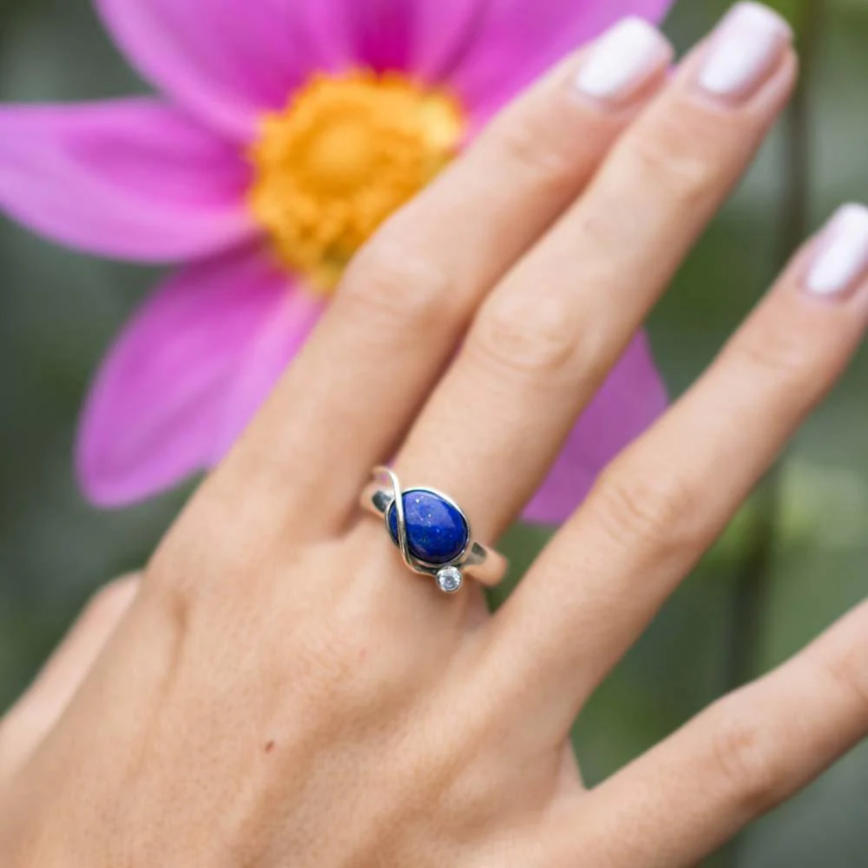 Deze sterling zilveren ring bevat een 10 x 8 mm lapis lazuli en een 2,5 mm zirkonia.