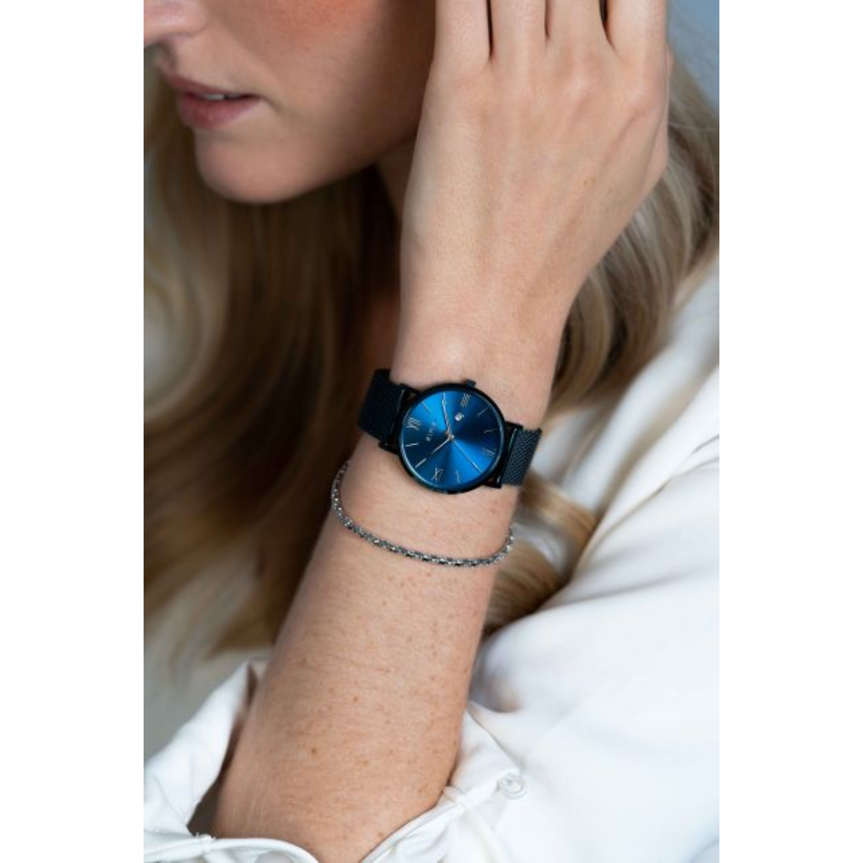 ZINZI Roman horloge blauwgekleurde wijzerplaat en kast met zilverkleurige wijzers blauwe stalen mesh band 34mm extra dun