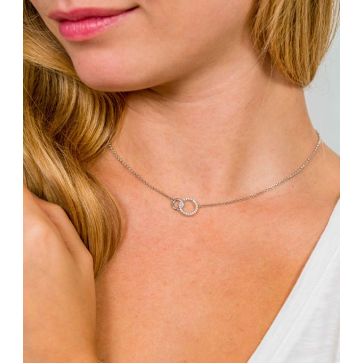 ZINZI zilveren trendy ketting, waarbij in het midden twee open vormen mooi met elkaar verbonden zijn: een glad open rondje en een groter open rondje bezet met witte zirconia's. De lengte is te variëren tussen 40 en 45cm.