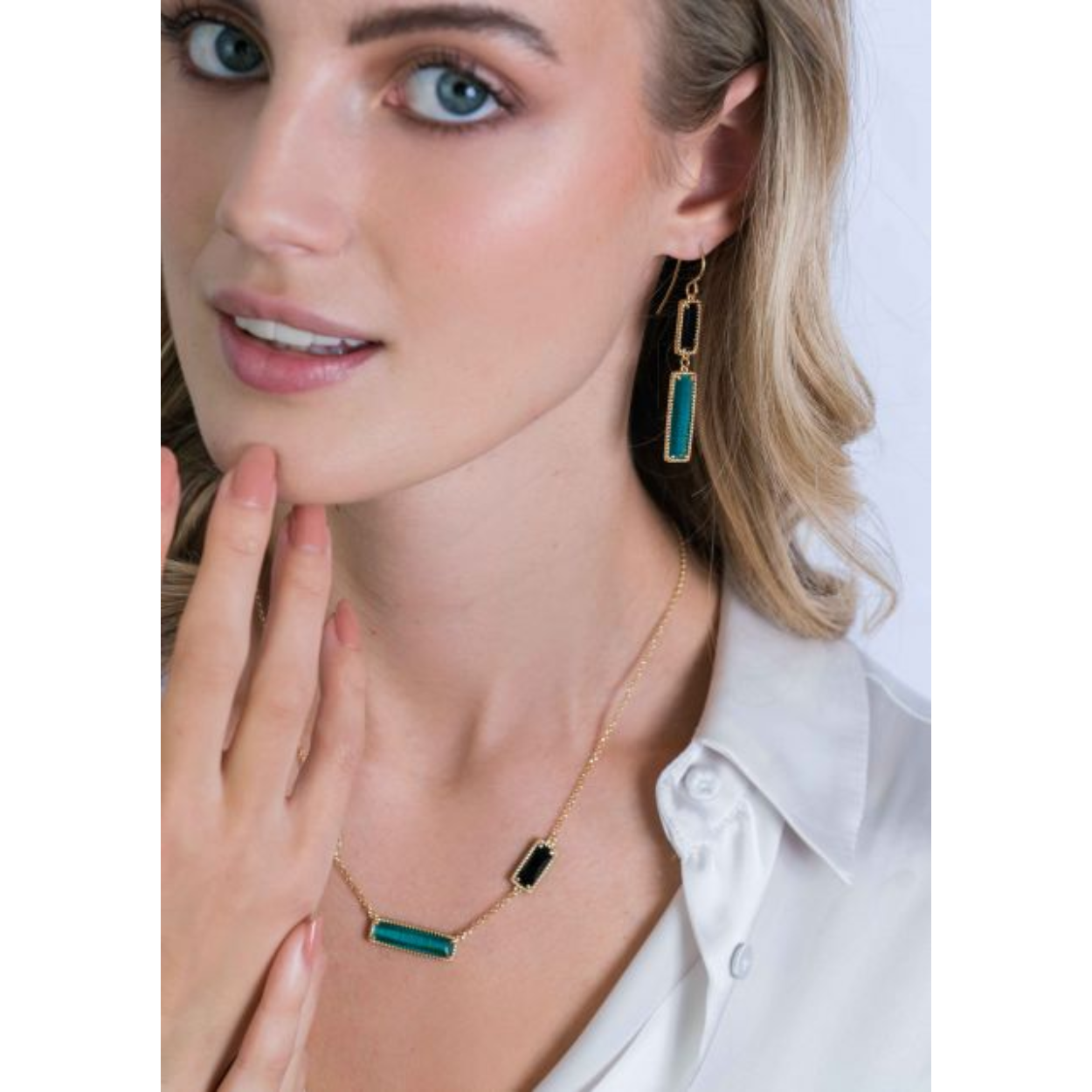 ZINZI zilveren oorhangers (57mm) in 14K geel verguld met twee sierlijk bewerkte rechthoeken, bezet met groene en zwarte kleurstenen.