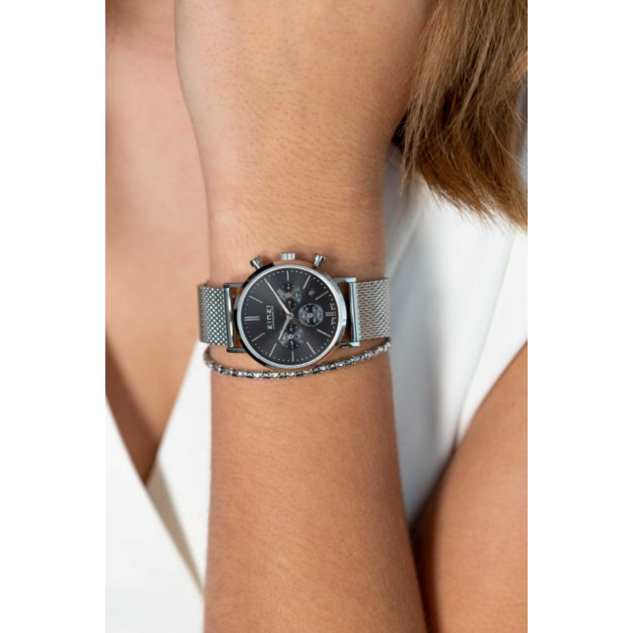 ZINZI horloge CHRONOGRAPH 34mm zwarte wijzerplaat met datum en chronometers, stalen kast, stalen mesh band 18mm