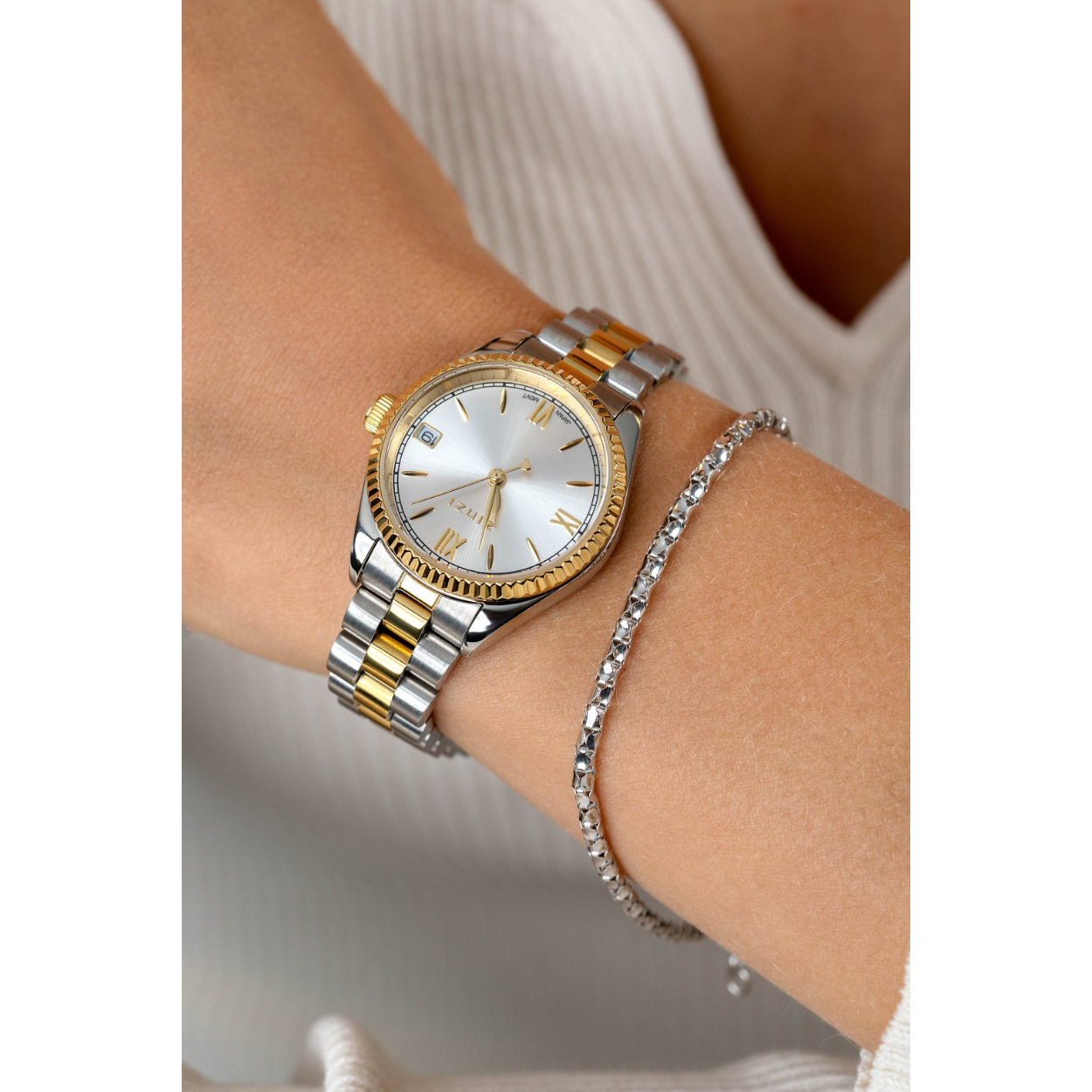 De ICONIC watch van ZINZI heeft een herkenbaar tijdloos ontwerp en een subtiel formaat van 30mm. Voorzien van een opvallende goudkleurige gekartelde rand rondom het glas, dat zorgt voor een schitterende luxueuze uitstraling. Het dameshorloge heeft een zilverkleurige 'sunray' wijzerplaat met Romeinse cijfers, datum met dag-aanduiding en een stoere stalen bicolor band met chique clip-sluiting. Leuk detail: de seconde wijzer met een subtiel hartje. Ook 5atm waterbestendig (tegen regen en spatwater) en met sterk mineraal glas.