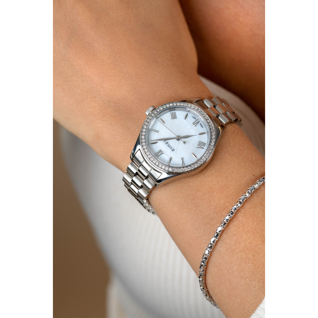 Het TRESOR dameshorloge heeft een schitterend stijlvol ontwerp. De horlogekast van 32mm is rondom bezet met witte zirkonia's. Voorzien van een witte parelmoer wijzerplaat, met zilverkleurige romeinse cijfers en zilverkleurige stalen schakelband met chique clip-sluiting. Leuk detail: de seconde wijzer met een subtiel hartje. Ook 5atm waterbestendig (tegen regen en spatwater) en met sterk mineraal glas.
